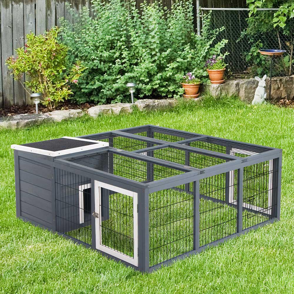 Ensure your pet stays healthy and happy with PawHut Small Animal Hutch. With plenty of space to hop around - this comfortable wooden hutch features a weather-resistant material and construction. The enclosed area is designed for privacy and rest, while the run offers a more open style built for play. The enclosed area is designed for privacy and rest, while the top can be opened and closed for easy access to the inside space for cleaning, feeding and other routine tasks. The water-resistant composite asphalt roof makes this rabbit hutch a perfect shelter. Suitable for outdoor and indoor use. Suitable for about two rabbits. Assembly required. Overall dimensions: H52 x W120 x L123cm. Main House Dimensions: H47 x W42.5 x L42.5cm. Door Size: H22 x L16cm. Run Box Door Size: H34 x L41cm. Please note: Rabbits need regular and frequent opportunities to exercise. Make sure your rabbits have opportunities to exercise every day to stay fit and healthy. Rabbits are most active in the early morning, late afternoon, and overnight, so every effort should be made to ensure rabbits have access to a large area to exercise at these times. The hutch provides shelter, while rabbits should additionally be provided with a large living enclosure.