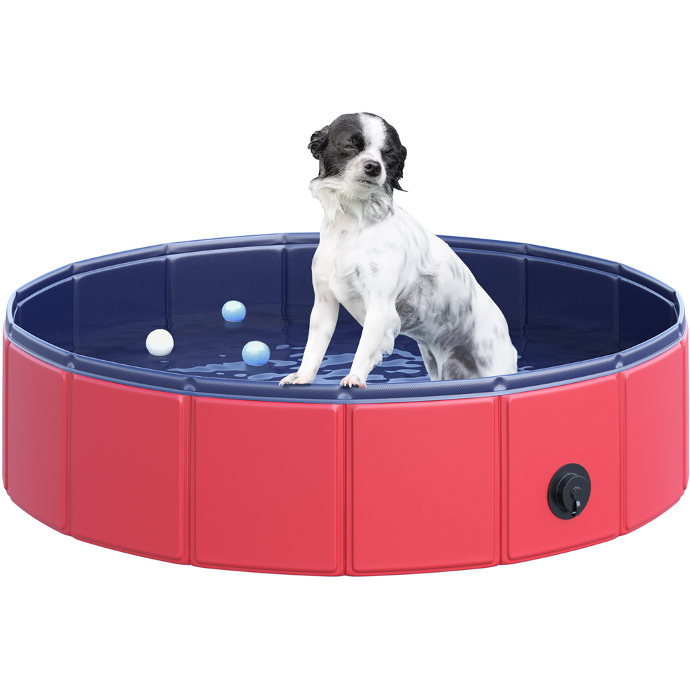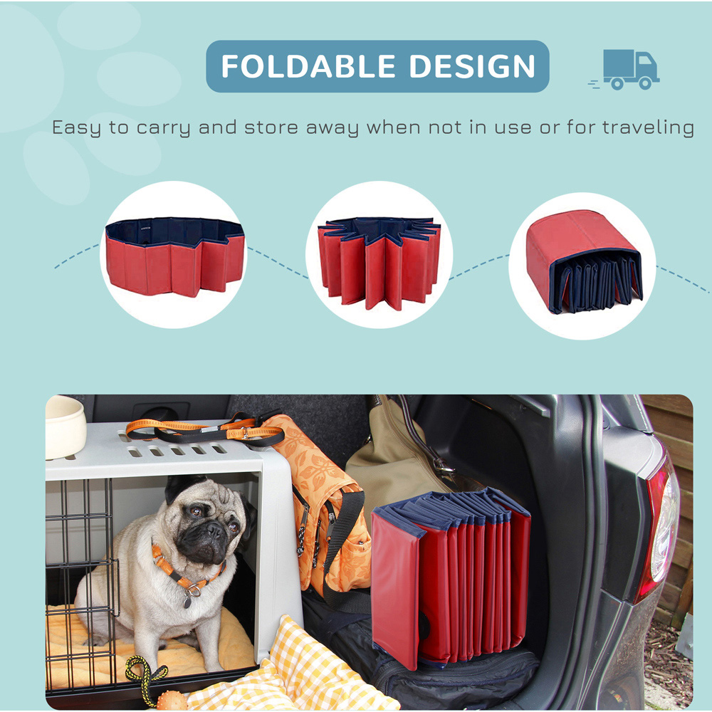 Ensure endless fun for your pets with the PawHut Red Foldable Pet Paddling Pool. Whether you use it for bathing your pets or letting them cool off on warm days, this pool is perfect for some water fun with your furry friends. Crafted from PVC materials, this plastic pool is suitable for all animals. It can be used as a pool for cats or dogs, a bathing tub, a sandbox, or even a ball pit. When not in use, it can be easily folded and stored away, saving space. Designed for both indoor and outdoor use - it is foldable, lightweight, and portable. With its sturdy construction of 15 blocks surrounded by wooden boards, there is no need to worry about collapse or other issues.