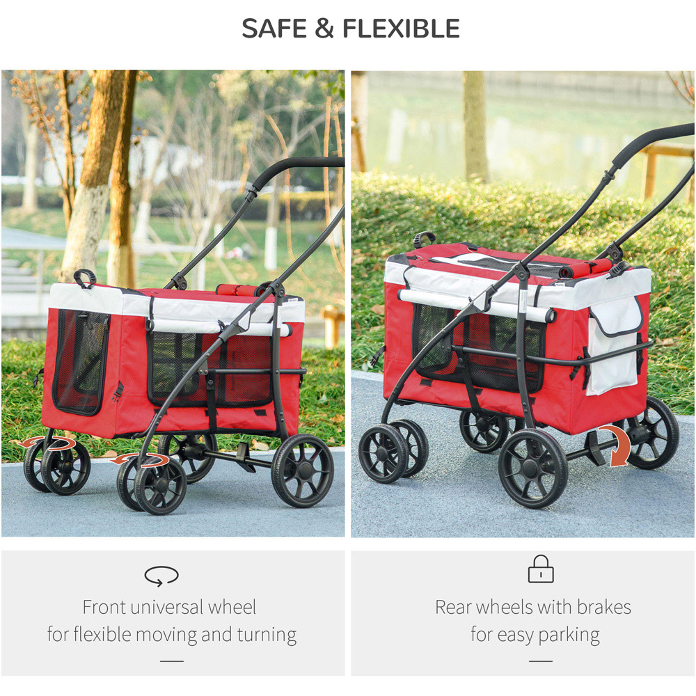 Take your pet wherever you go with this PawHut Red Foldable Pet Stroller with Detachable Carrier. This pet stroller is perfect for pet owners always on the move. Comfortable and functional, pets can lounge in this soft-padded cart, enjoying the cool breeze flowing through the mesh window. Moreover, you can remove the detachable compartment to use it as a carrier - offering flexibility and convenience for different situations. Easy to store, the frame is foldable to ensure effortless storage and portability, so you can take it anywhere. Prioritising safety, there are two safety leashes and dual rear brakes. Plus, the stroller comes with universal EVA wheels to move it around without much hassle.