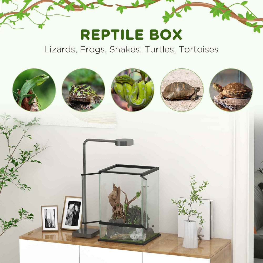 Discover the PawHut Reptile Terrarium 40L, designed to offer a safe and spacious environment for your reptiles. This 12L terrarium is ideal for lizards, frogs, snakes, turtles, and tortoises, providing ample room for roaming and relaxation. It features a secure top mesh lid with a lock to prevent escapes and ensures proper ventilation with its air vents. The space for a heating pad and easy-to-clean design enhance its practicality, while the 360-degree view lets you observe your pets comfortably.