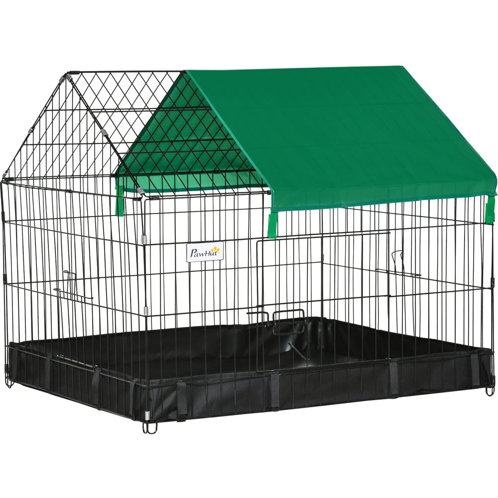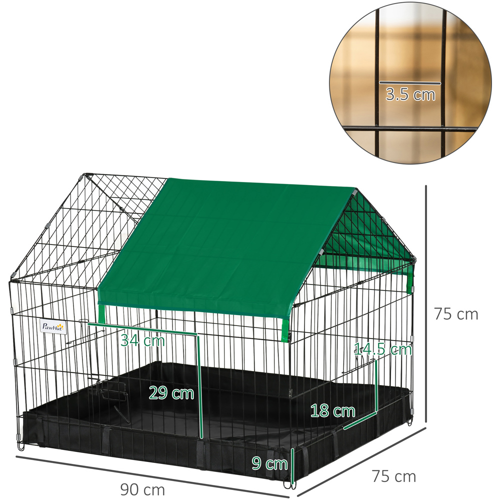 Give your small pets a spacious and secure area with the PawHut Animal Cage with a Waterproof Roof 90 x 75 x 75cm. It provides ample space for guinea pigs, rabbits, and other small animals to rest and roam. The steel wire structure ensures a ventilated habitat, allowing you to easily observe your pets from any angle. The cage features a water-resistant Oxford fabric bottom, making it easy to clean and maintain. With two doors for convenient access, it's simple for pets to get in and out. This easy-to-set-up cage is the perfect solution for keeping your pets protected and secure.
