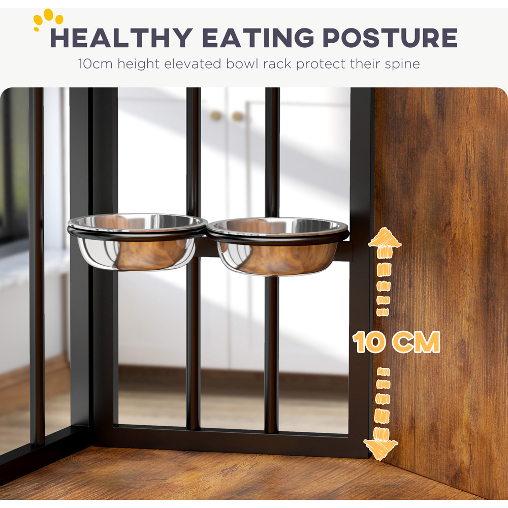 Transform your living space and give your furry friend a cosy corner with the PawHut Dog Crate Furniture. This innovative dog crate fits snugly against any wall, doubling as chic furniture while maximising room. It includes a built-in feeding rack with two bowls at a comfortable height, ensuring mealtime is easy and stylish for dogs up to 15kg.