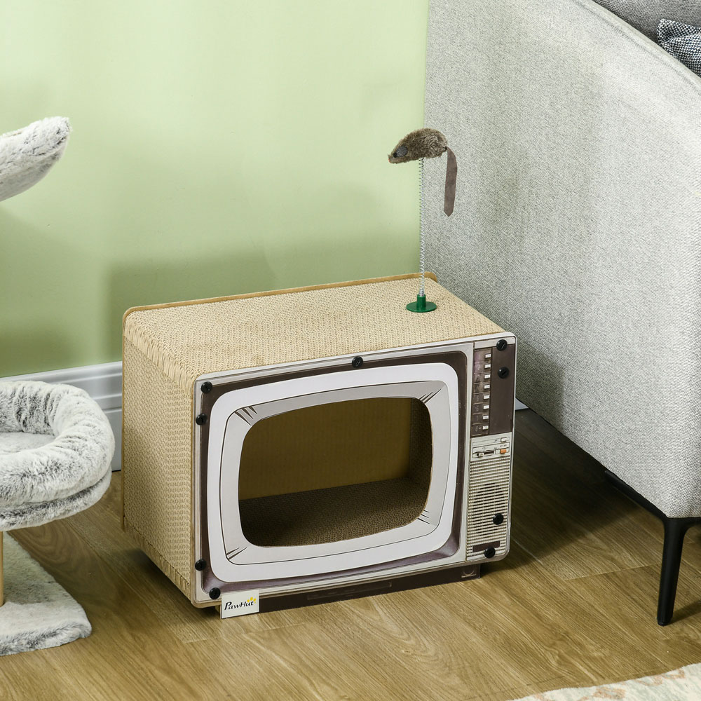 This TV-shaped Scratching Board and Cat Bed from PawHut will bring endless fun to your feline friends. It provides opportunities for hide-and-seek play and fulfils their scratching needs. The toy mouse adds to the excitement, letting them act on their hunting instincts. Cats will love to sink their claws into this scratching board, keeping them healthy. The toy mouse grabs their attention when feeling playful, keeping them entertained. It deters them from destroying sofas, carpets and curtains. It also includes catnip to help your cat quickly adapt to their new spot. Made from corrugated cardboard, it's a safe and odourless haven for pets. Easy to assemble – all you need to do is place the toy mouse on top.