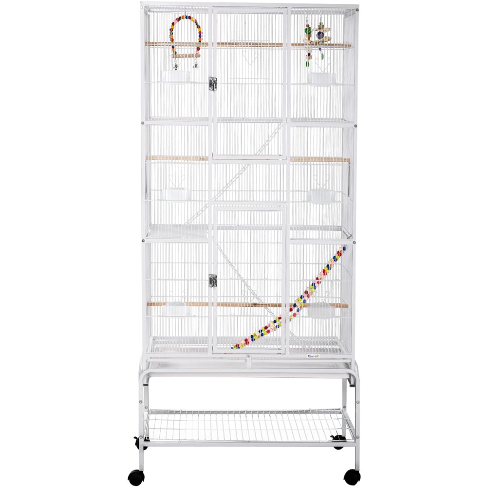 Need a spacious spot where birds can feel secure? This PawHut Bird Cage in white is the solution. Spacious enough to spread wings – this flight cage features multiple wooden perches for resting on and plastic food and water containers inside. The 1cm bar spacing ensures the security of finches, canaries, parakeets, budgies, cockatiels and more. This cage with a stand comes with a swing, other bird toys, ladders and platforms to help you build a sweet home, adding extra fun for your feathered friend. It has two large doors and ten small doors, so you can easily access and maintain the finch cage and interact with the birds. The removable tray at the bottom for quick cleaning, keeping their space tidy. The bottom shelf provides a convenient place to store pet supplies. The stand underneath with four wheels for easy movement and two have brakes for security.