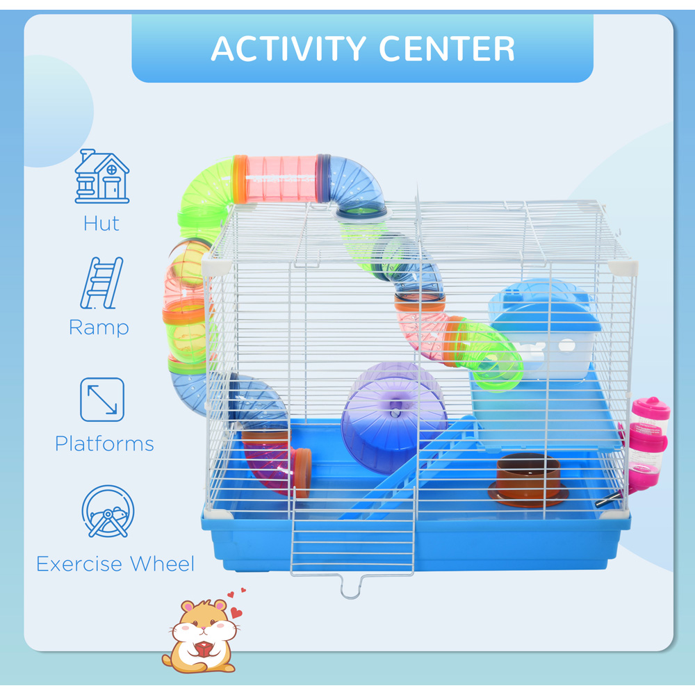 Keep your furry friends stimulated, safe and happy with the PawHut Hamster Cage Carrier with Exercise Wheels and Tunnel Tube. With its two-tier design, it provides ample space for them to move around and stay active. The cage features an elevated platform, a large tunnel that goes both inside and outside, an exercise wheel, a food dish, and a water bottle. The addition of a play tunnel adds an element of fun to their daily routine. The cage is equipped with a handle for easy carrying and a removable bottom tray for effortless cleaning. This multi-activity home is perfect for small pets like hamsters, mice, and gerbils. Rest assured, the plastic structure is non-toxic, ensuring the safety of your pets. The cage is designed without any gaps, so there is no risk of their paws getting caught or pinched. The front door allows easy access for your pet, and the detachable plastic tray makes cleaning and refilling essentials a breeze. Dimensions: H37 x W30 x L46cm.
