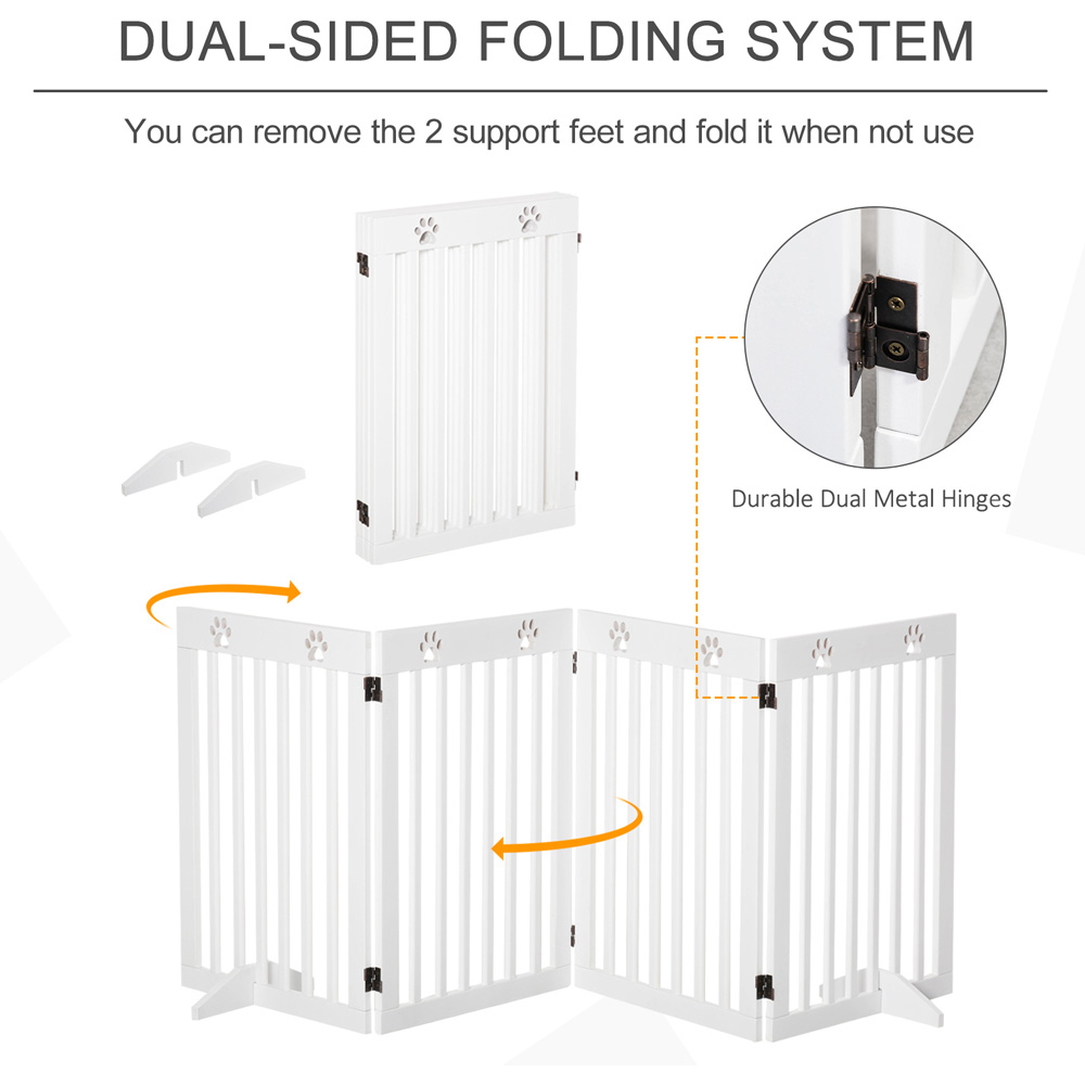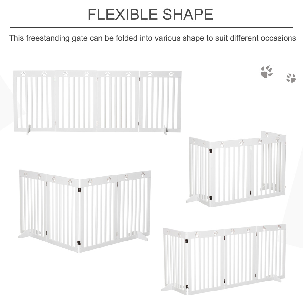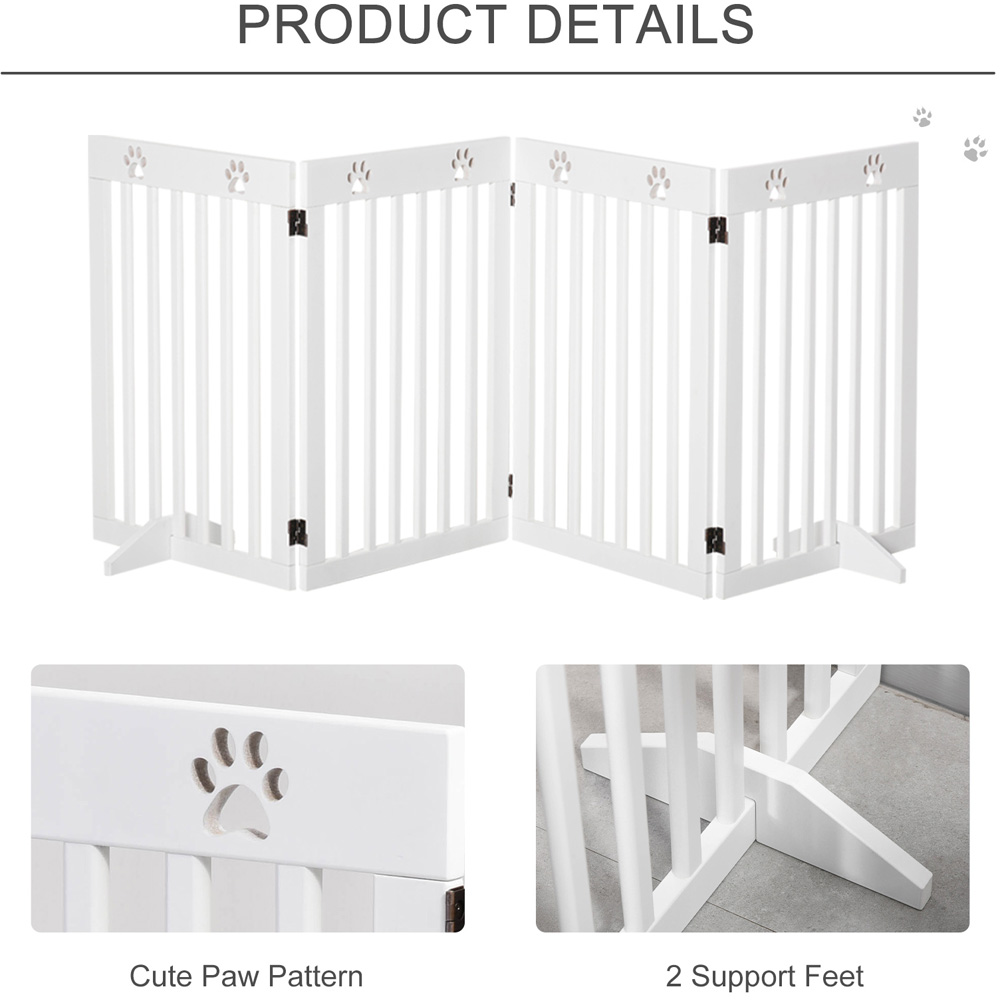 Keep your pets confined to a specific area with the PawHut Wooden Freestanding Pet Safety Gate. This puppy gate is designed to effectively restrict your pet's movements safely. Consisting of four MDF panels connected by hinges, it can be adjusted to various shapes as needed. Crafted from sturdy MDF board and high-quality dual hinges, this dog barrier is durable and pet-friendly. The smooth surface adds an extra layer of safety, ensuring that your pets remain securely enclosed while you are not around. When not in use, the dog fence can be conveniently folded up to save space. With a dual-sided folding system, it can be configured into different shapes, making it suitable for various-sized spaces. The spacing between bars prevents pets from feeling trapped. Ideal for doorways, stairs, entrances, and more, this product is a valuable tool in keeping pets safe and secure.