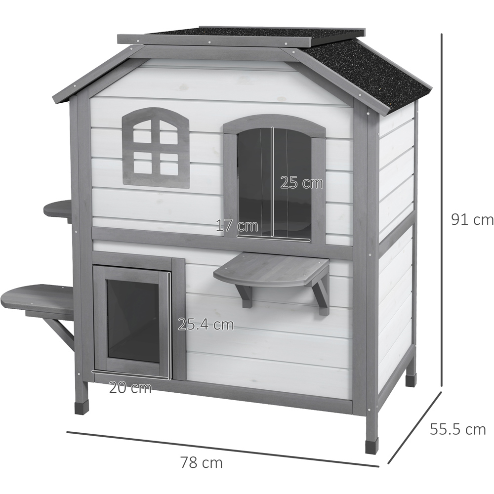 Create the perfect retreat for your cat with this PawHut White Kitten Condo, Catio Enclosure Furniture, and White. Constructed of fir wood with painting, this two-floor cat shelter can withstand being outdoors, and it's hard enough to hold up to 30kg. Its asphalt roof and wooden structure are water-resistant. With three jumping steps, two doors, a floor hole and an escape door, there are plenty of fun ways to get in and out for your cat. Finished with an openable roof, making it easy to get in and clean this cat house. It also keeps their area ventilated, preventing unpleasant odours from forming.