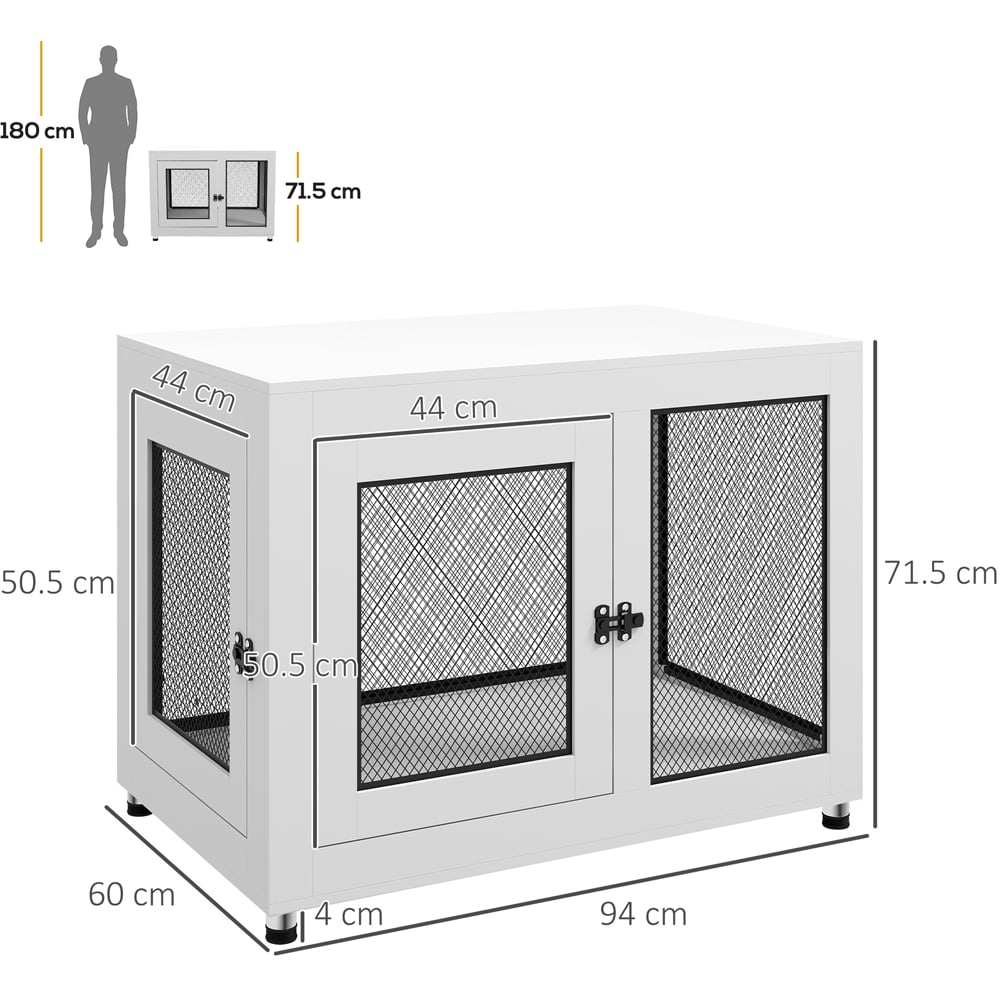 Get the perfect solution for your pet's comfort and your home decor needs with the PawHut White Lage Dog Pet Crate Side Table with Cushion. This multifunctional dog cage features a comfortable and secure space for your pet to relax, with the added bonus of a sleek table top for displaying your favourite items. Your pets can enter through the front or side door and cosy up on the soft, washable cushion, while the steel wire construction allows for optimal airflow to keep them cool and comfortable. The lockable doors ensure that your pets are safe and secure. Crafted from durable particle board and strong steel wires, this indoor dog kennel is built to last. Additionally, the cage is equipped with adjustable feet to prevent scratches on your floor and to maintain stability. It's a practical and stylish solution for pet comfort and home decor. Dimensions: H71.5 x W60 x L94cm.