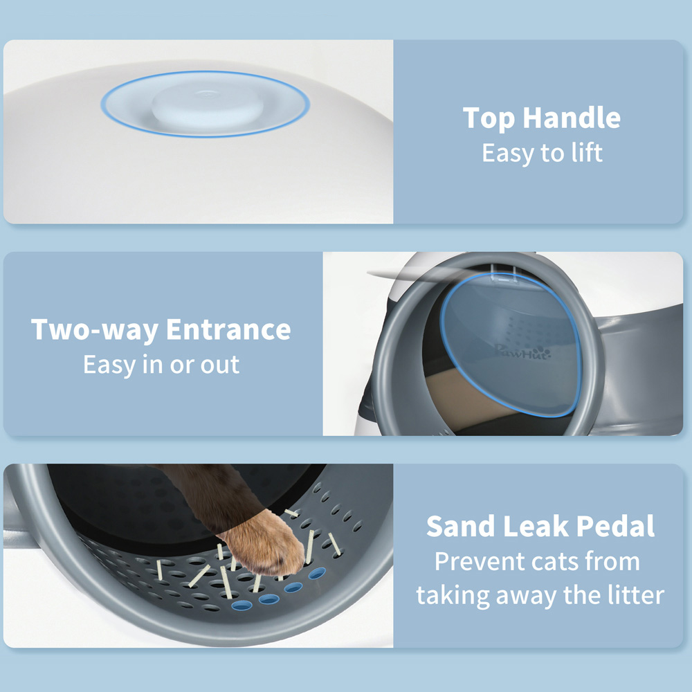 Get a stylish solution for your cat's litter needs with this PawHut White Portable Cat Litter Box. With a cool, trendy look, this litter box has a large main room with a door for easy access, an openable lid, and a litter scoop attached to the side to clean the mess easily. Additionally, the sand leak pedal stops your cats from spreading litter everywhere. Now your furry friend can litter in their own space with ease and comfort. The modern enclosed design with a strong and durable structure conceals any odours, and the high-edge sides prevent litter from falling out. It is a portable litter box that doesn't take much room and can be taken anywhere with ease.