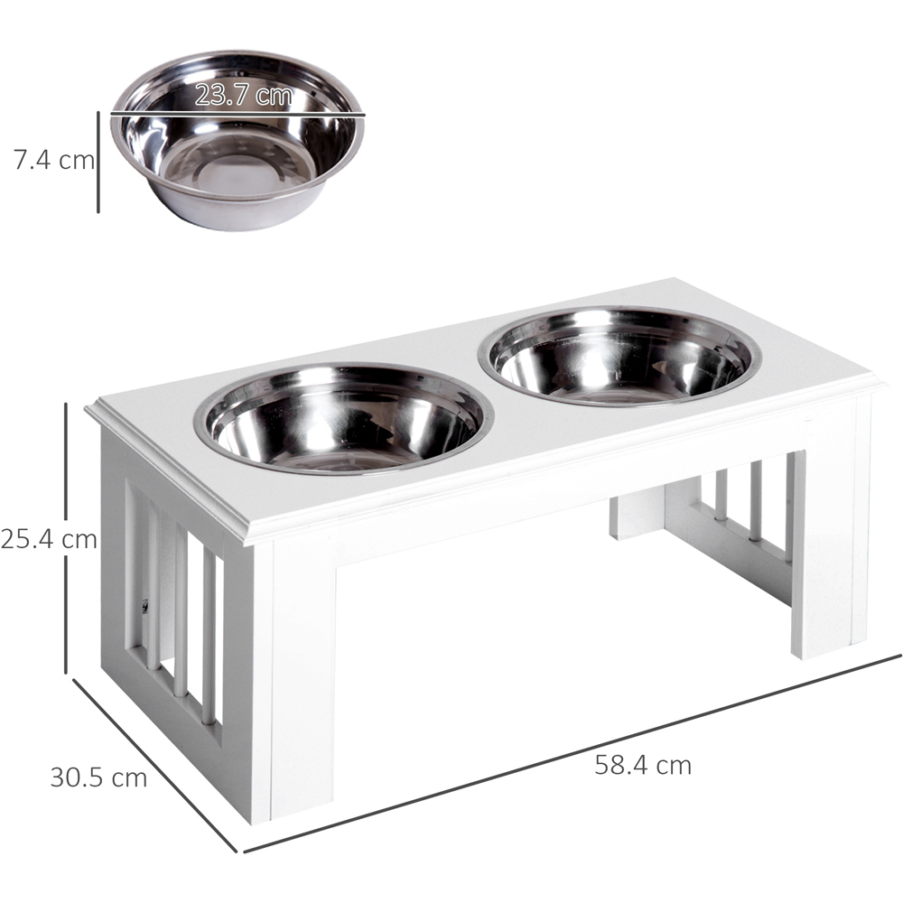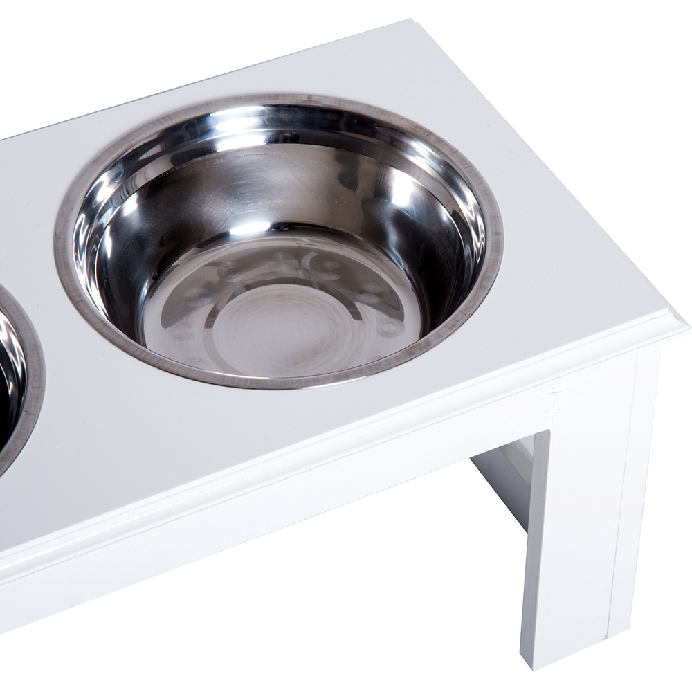Serve delicious meals for your pet dog with the PawHut Double White Elevated Bowl Pet Dog Feeder. It is crafted using a solid MDF base with an elevated design and includes two round stainless-steel bowls. These removable bowls are hygienic and dishwasher safe with an ideal design for serving both food and drink. This elevated feeder with a non-slip base helps make eating cleaner and easier for your pets, reducing the strain on their necks while aiding the digestion process.