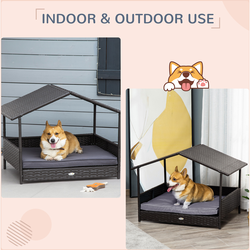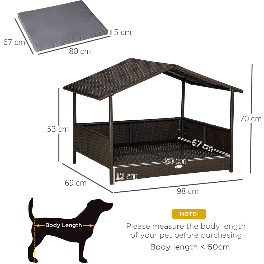 Keep your furry friend comfortable in this PawHut Wicker Pet House with Grey Cushion. This bed is the perfect place to take the weight off your pet's paws and let them lay on a thick-padded bed and a soft, washable cushion. Suitable for outdoors, its raised base keeps pets off the dirty ground, while the canopy offers shelter and shade - perfect for all weather conditions. Ideal for small and medium dogs, the steel structure provides safety and support. Sturdy and durable, the pet house is made using a steel frame and covered in hand-woven rattan.