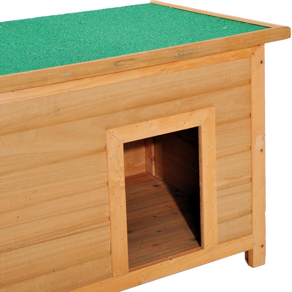 This PawHut Dog Kennel provides your dogs with a comfortable and cosy shelter they dream of. Built of solid and weather-resistant fir wood, the wooden dog kennel is made for years of use with very little maintenance. Its surface is waterproof painted for durability and to make it suitable for both indoor and outdoor use. The elevated floor can keep the floor warm and dry in the winter and cool in the summer. The cleaning work can be quite easy as you just need to open the roof and clean the dirt out. With the slant asphaltic roof, this puppy pen is in excellent drainage. The roof can be opened for easy cleaning. Simple and quick assembly is required.
