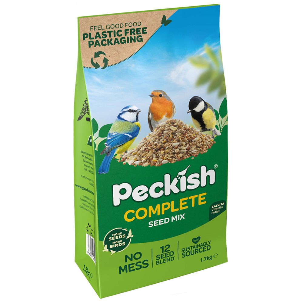 Attract birds to your garden by feeding them Peckish Bird Complete Seed Mix. This seed mix is a unique blend packed with energy and nutrition. With added Calvita Vitamin Mix, it has everything a bird needs to fuel them for longer. Packed with 12 different ingredients, this high-energy blend attracts robins, blackbirds, long-tailed tits, great tits, song thrush, chaffinch, house sparrows, house tit and many more to your garden. No mess, husk free reduces waste. Plastic-free packaging. Size: 1.7kg. Feeding guidelines: Best used with our peckish three port seed feeder Where to Site Site your feeder two metres from cover to make the feeder visible, whilst providing a safe place to retreat. Put out food at the start of the day to ensure that birds can replace the energy they have lost overnight. How to Use Simply pour or scoop the food into a seed feeder, onto a bird table or in a ground feeder away from pets or pests. Feeding Tips With food resources scarcer now, it is essential to feed garden birds all year round. Ingredients: Kibbled Wheat, Red Dari, Kibbled Maize, White Millet, Sunflower Hearts (7%), Red Millet, Naked Oats, Flaked Naked Oats, Vitamin Suet Pellet (4%) (Wheat Flour, Beef Tallow, Calcium Carbonate. Additives: Vegetable Glycerine, Calvita Vitamin Blend, Colourant), Safflower Seed, Pinhead Oatmeal, Oyster Shell Pieces, Vegetable Oil.