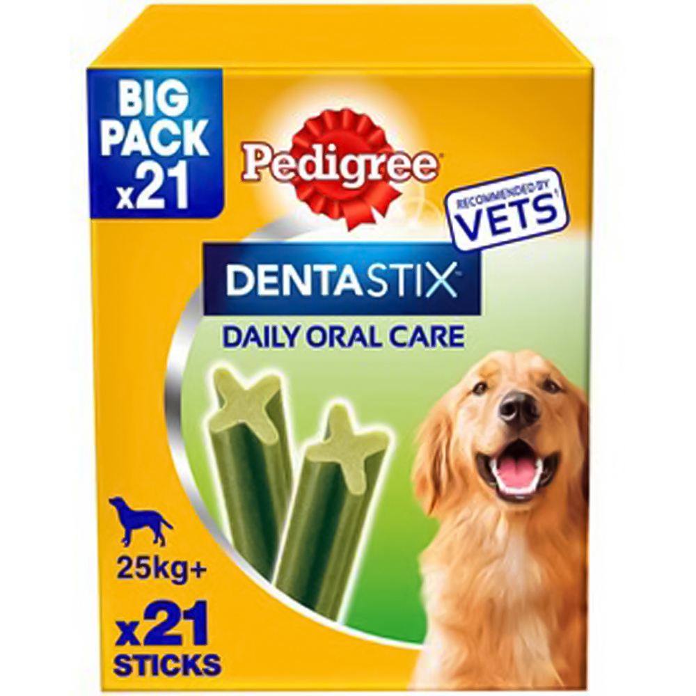 Make sure to maintain your dog's dental hygiene with these Pedigree Dentastix Fresh Daily Oral Care Small Adult Dog Stick Treat 810g 21 Pack. These chews feature Triple Action technology that is scientifically shown to decrease tartar buildup by up to 80%, clean hard-to-reach teeth, and promote gum health. The Dentastix Fresh dental chews include a special blend of green tea extract and eucalyptus oil, which have been proven to help keep your breath fresh for enjoyable close moments with your dog. The daily fresh dental chews for dogs are low in fat, contain no added sugar, and are free from artificial colours and flavours, making them a healthy treat option with added benefits. This pack includes 21 chew sticks.