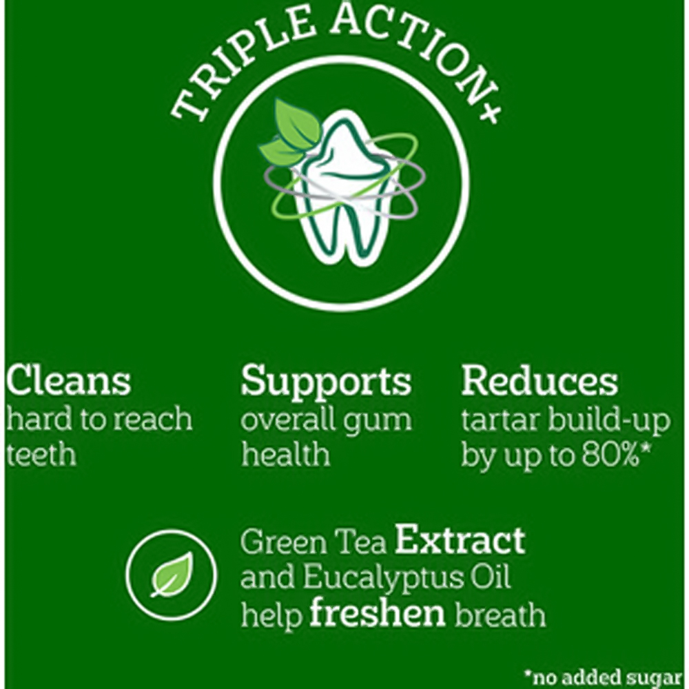 Make sure to maintain your dog's dental hygiene with these Pedigree Dentastix Fresh Daily Oral Care Small Adult Dog Stick Treat 550g 35 Pack. These chews feature Triple Action technology that is scientifically shown to decrease tartar buildup by up to 80%, clean hard-to-reach teeth, and promote gum health. The Dentastix Fresh dental chews include a special blend of green tea extract and eucalyptus oil, which have been proven to help keep your breath fresh for enjoyable close moments with your dog. The daily fresh dental chews for dogs are low in fat, contain no added sugar, and are free from artificial colours and flavours, making them a healthy treat option with added benefits. This pack includes 35 chew sticks.