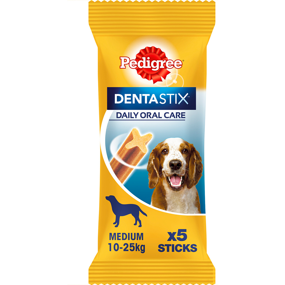 Maintain your dog's dental health with these Pedigree Dentastix Daily Oral Care Medium Adult Dog Stick Treat 128g 5 Pack. These chews feature Triple Action and have been scientifically shown to reduce tartar accumulation by as much as 80%, clean difficult-to-reach teeth, and promote gum health. Dentastix dental treats for dogs are low in fat, contain no added sugars, and are free from artificial colours and flavours, making them healthy treats with added benefits. Pedigree daily chews for dogs deliver effective oral care for medium-sized dogs. The package includes five sticks.