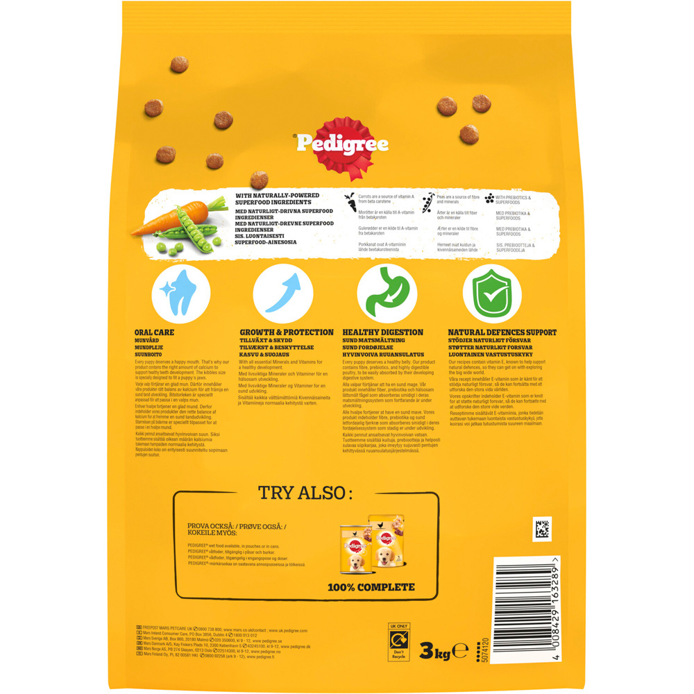 Give your puppy the best start in life with Pedigree Junior Complete Chicken and Rice Dry Puppy Food 3kg. This tasty kibble, made with selected natural ingredients and enriched with essential vitamins and minerals, is designed to fuel your pup's energetic spirit. This dry puppy food is a delightful way to support your furry friend’s growth and vitality with the perfect balance of calcium for healthy teeth and a size that's easy for little jaws to chew.