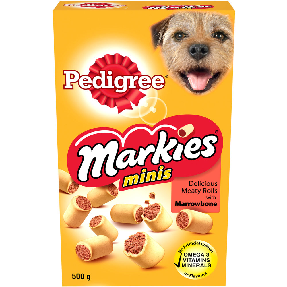 Reward your furry friend with Pedigree Markies Mini Dog Treats 500g. The fun, round shape makes it ideal for rolling, throwing, and catching, turning their treat time into playtime. Each bite features a tasty meaty centre wrapped in a crunchy, marrowbone flavoured biscuit. Enriched with omega-3, calcium, and essential vitamins and minerals, these treats help support your dog's overall health and vitality. Flavour: Meat and marrowbone. Ingredients included are Cereals, Meat and Animal Derivatives (including 4% Marrowbone, including 4% Meat), Various Sugars, Oils and Fats, Minerals, Derivatives of Vegetable Origin, Preservatives.