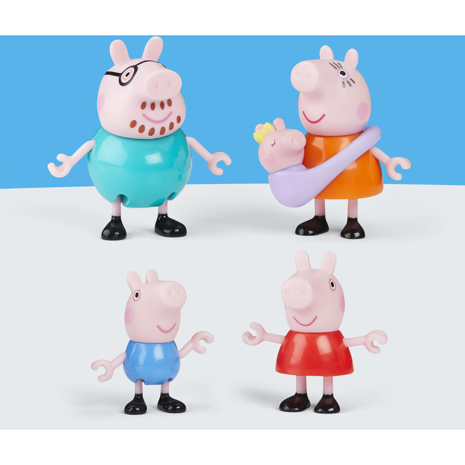 Celebrate the joys of family time with the Peppa Pig Family of Five Toy Set. Featuring Daddy Pig, Mummy Pig, George, Peppa and the newest addition, Baby Evie in her carrier, this charming collection lets kids recreate heartwarming scenes or invent their adventures. Baby Evie's carrier attaches to Mummy or Daddy Pig for on-the-go play, and the figures are designed to hold hands for sweet, connected moments. This set is the perfect gift for fans aged three years and up, especially for little ones welcoming a new sibling!