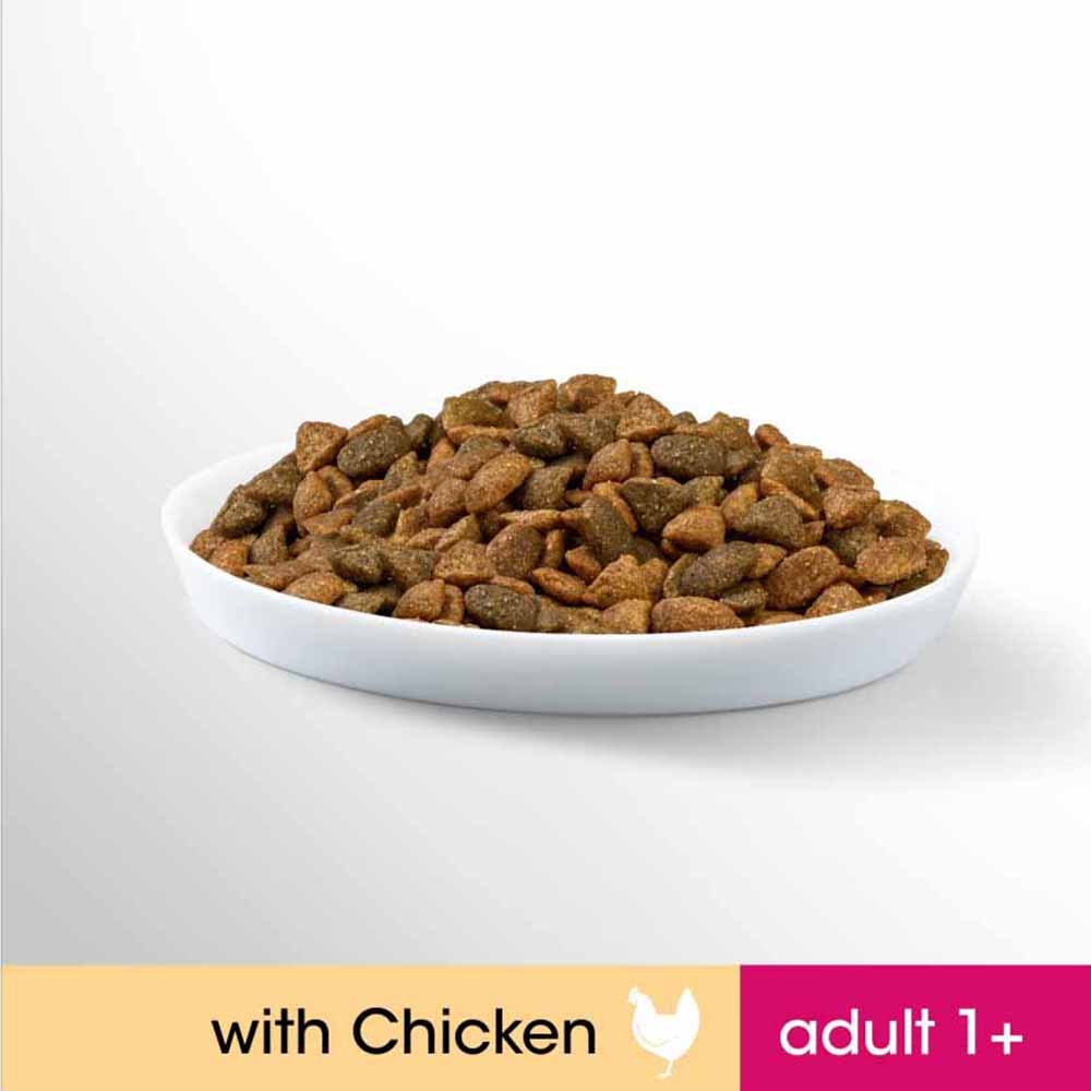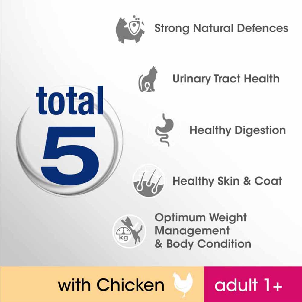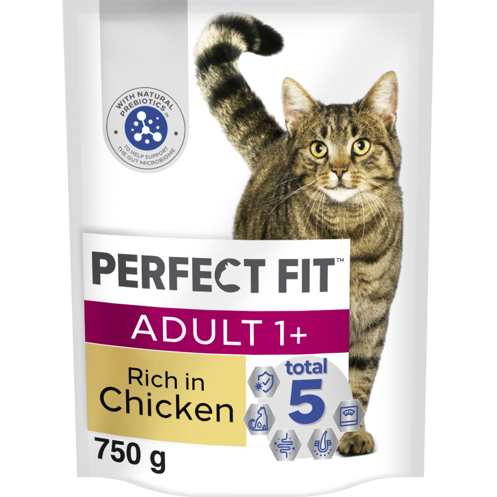 Indulge your whiskered companion with a symphony of flavours and nutrition with this Perfect Fit Advanced Nutrition Adult One Plus Dry Cat Food Chicken. Developed with the Waltham Petcare Science Institute's vets and pet nutritionists, the cat food provides expert nutrition that has a unique total-five formula, addressing some of the most common health needs of pets and providing all-around protection. Made with natural prebiotics to help support the gut microbiome, the cat food is complete and balanced to sustain the cat's vitality and supplemented with vitamins B and iron to maintain the cat's agility. Chicken cat food is made with high-quality proteins for strong muscles and yeast, a natural source of prebiotics, to support healthy digestion. It also contains zinc for healthy skin and coat, and the crunchy texture contributes to clean teeth, which benefits the gums. Quantity: 750g.