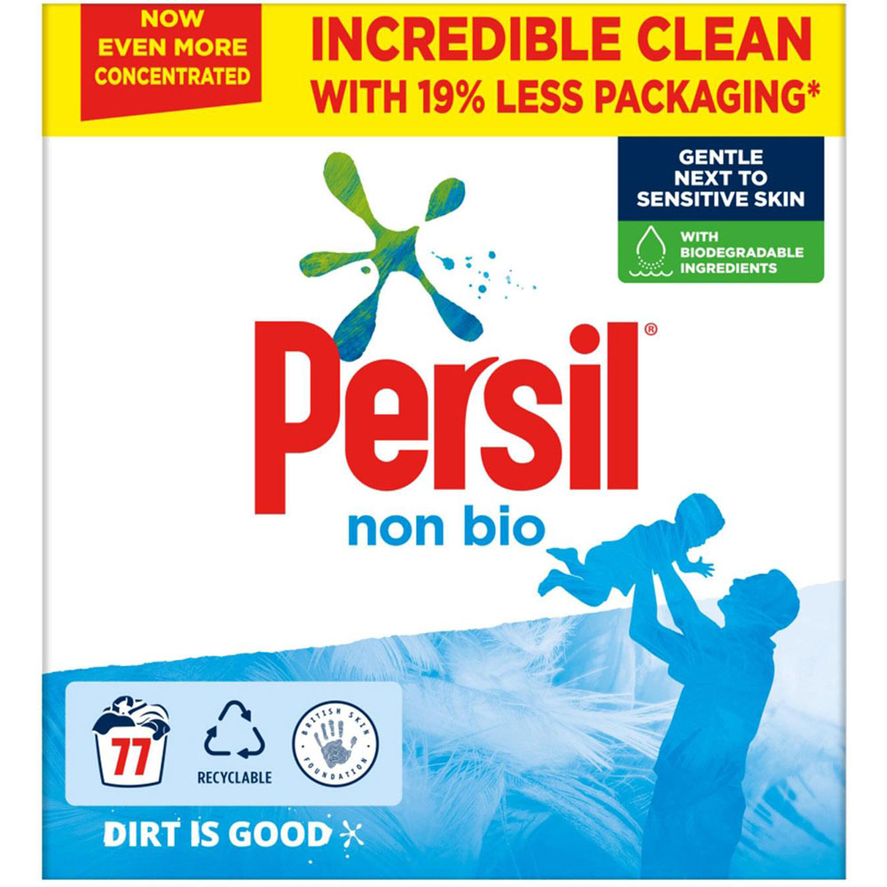 Persil Non-Bio Washing Powder not only tackles tough stains but also cares for sensitive skin, making it a perfect choice for your family's laundry needs. Recognised by the British Skin Foundation, this dermatologically tested formula is gentle on the skin yet effective on stains such as oil and dirt, even in quick wash settings. It's ideal for washing baby clothes, ensuring a kind touch for everyone from newborns to adults. Additionally, with its biodegradable ingredients and fully recyclable packaging, it's as gentle on the planet as it's on your skin and clothes.