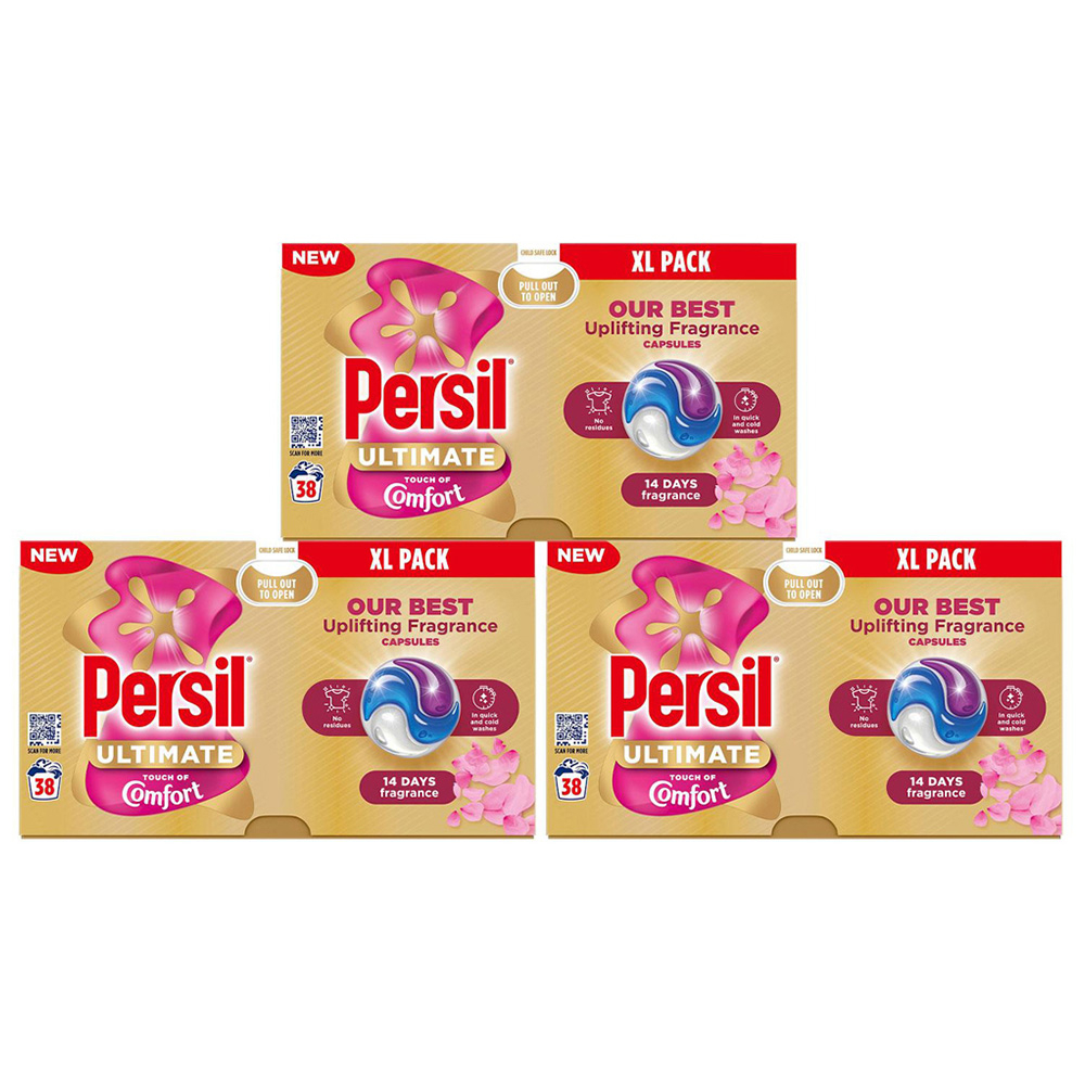 Persil Ultimate Touch of Comfort Washing Capsules remove tough stains and are infused with an uplifting Comfort fragrance that lasts up to 14 days, leaving your family with fragrant, clean clothes time and time again. They are Persil's fastest-dissolving capsule, even in quick and cold washes, so you can use them in the most energy-efficient programmes without worrying about residue. These laundry capsules tackle stubborn stains, from pasta sauce to iced coffee to mud, offering effective stain removal even at low temperatures. Plus, the packaging is recyclable and plastic-free.