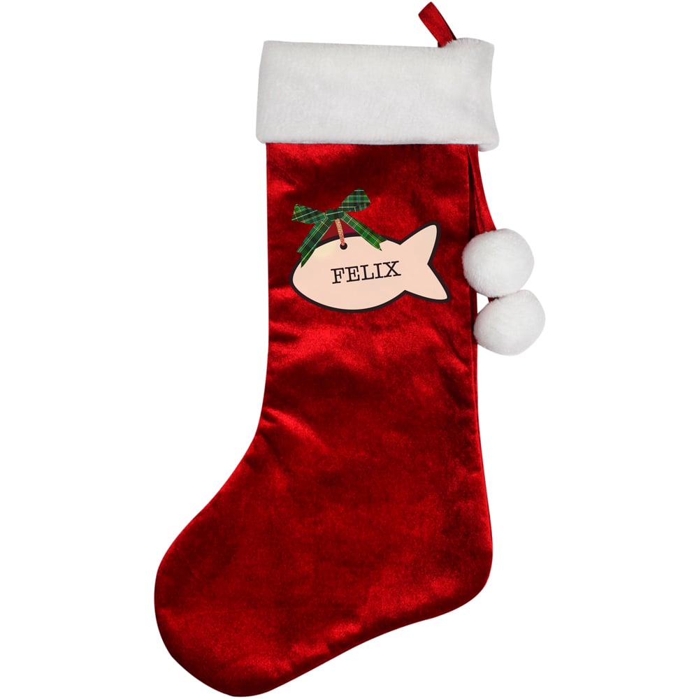 Pets like treats at Christmas too. You can personalise this Cat Treats Stocking with a name up to 15 characters in length. All personalisation entered will appear in uppercase. This red velvet stocking with soft plush white cuff features a hoop on the top to enable the stocking to be hung. Material is 100% Polyester. Ideal for pets, Christmas, cat lovers.