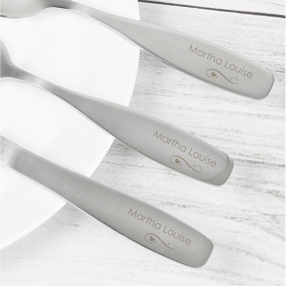 Help teach young children how to eat with this gorgeous 3 Piece Heart and Swirl Cutlery Set This stainless steel cutlery set can be personalised with any name up to 15 characters. All personalisation will appear as entered. Please note - Not suitable for children under 36 months. Cutlery measurements Fork 14.2cm Knife 16.8cm Spoon 13.7cm Ideal for Birthday, Christening, Confirmation, Naming Day, Baptism. When you have placed your order, you will receive an email containing a link to personalise your item. Follow the link to submit the personalised details you require. If we don't receive your personalisation within 24 hours the order will be cancelled. Please check your junk folder for the email. Once personalisation has been submitted the order cannot be cancelled or amended as it will automatically be sent into production and will be despatched within 3 working days.