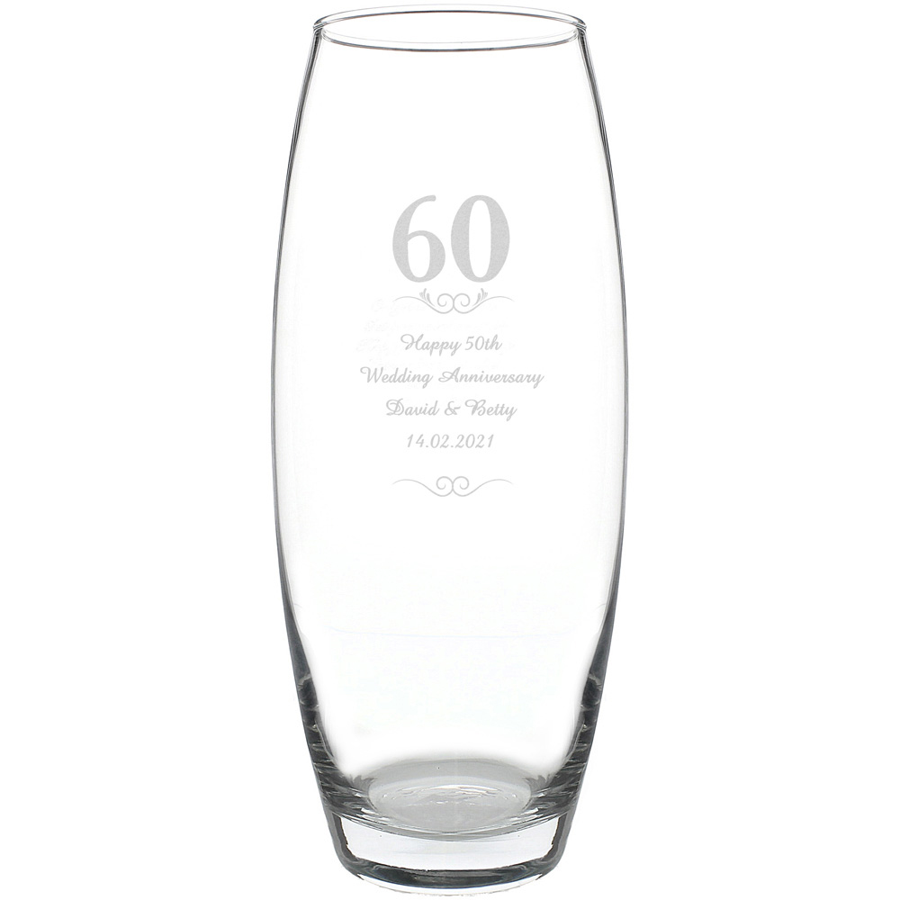 Personalise this elegant 60 Years Bullet Vase with up to four lines of 20 characters each. The 60 is fixed text and the hearts and swirls are a fixed design element. Hand Wash Only. Due to the font type used please refrain from using all capitals in your personalised message. If the message is all in capitals you will find the personalisation extremely difficult to understand and may even result in personalisation being missed off the product. Many thanks for your cooperation. Ideal for Anniversaries. When you have placed your order, you will receive an email containing a link to personalise your item. Follow the link to submit the personalised details you require. If we don't receive your personalisation within 24 hours the order will be cancelled. Please check your junk folder for the email. Once personalisation has been submitted the order cannot be cancelled or amended as it will automatically be sent into production and will be despatched within three working days.