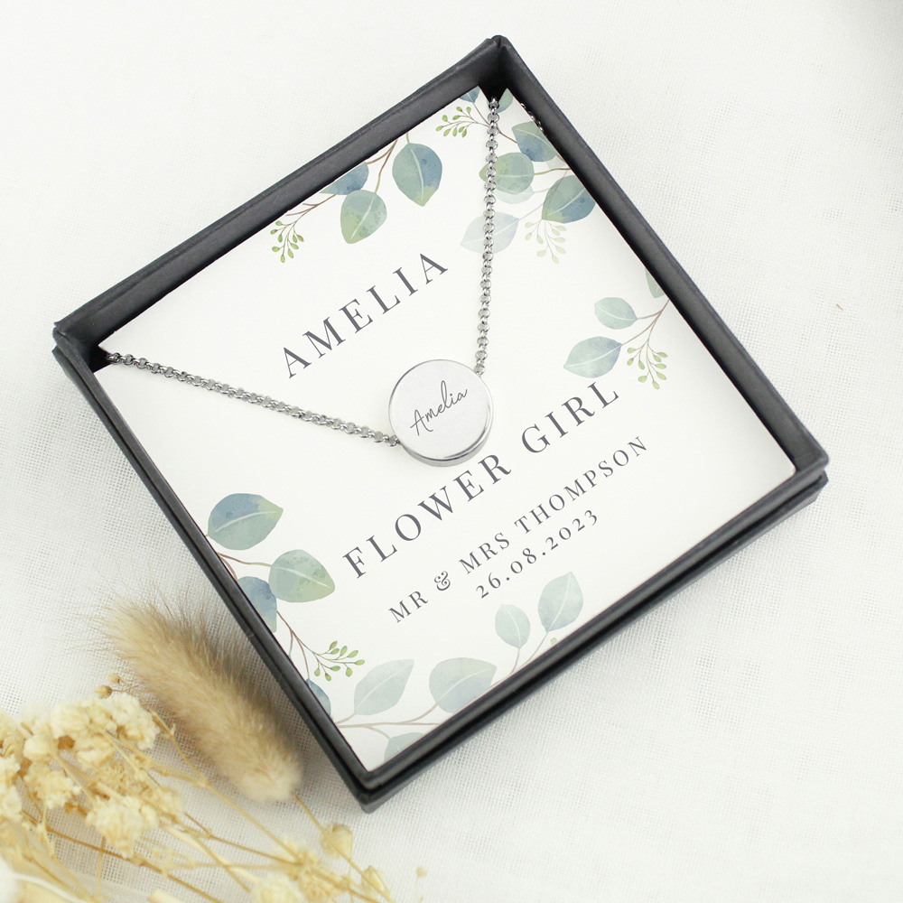 This personalised disc necklace has been beautifully paired with a personalised botanical keepsake sentiment card. Presented in a stylish gift box, it is a treasured gift for any member of the Wedding Party. Line 1 [Necklace & Sentiment Card] - 12 Characters Line 2 [Sentiment Card] - 20 Characters Line 3 [Sentiment Card] - 30 Characters Line 4 [Sentiment Card] - 30 Characters. Please note, the personalisation on the necklace is case sensitive and will appear as entered. All other personalisation will appear in fixed upper case. The length of the chain is 18 inches and comes presented in a stylish gift box. Ideal for Weddings. When you have placed your order, you will receive an email containing a link to personalise your item. Follow the link to submit the personalised details you require. If we don't receive your personalisation within 24 hours the order will be cancelled. Please check your junk folder for the email. Once personalisation has been submitted the order cannot be cancelled or amended as it will automatically be sent into production and will be despatched within 3 working days.