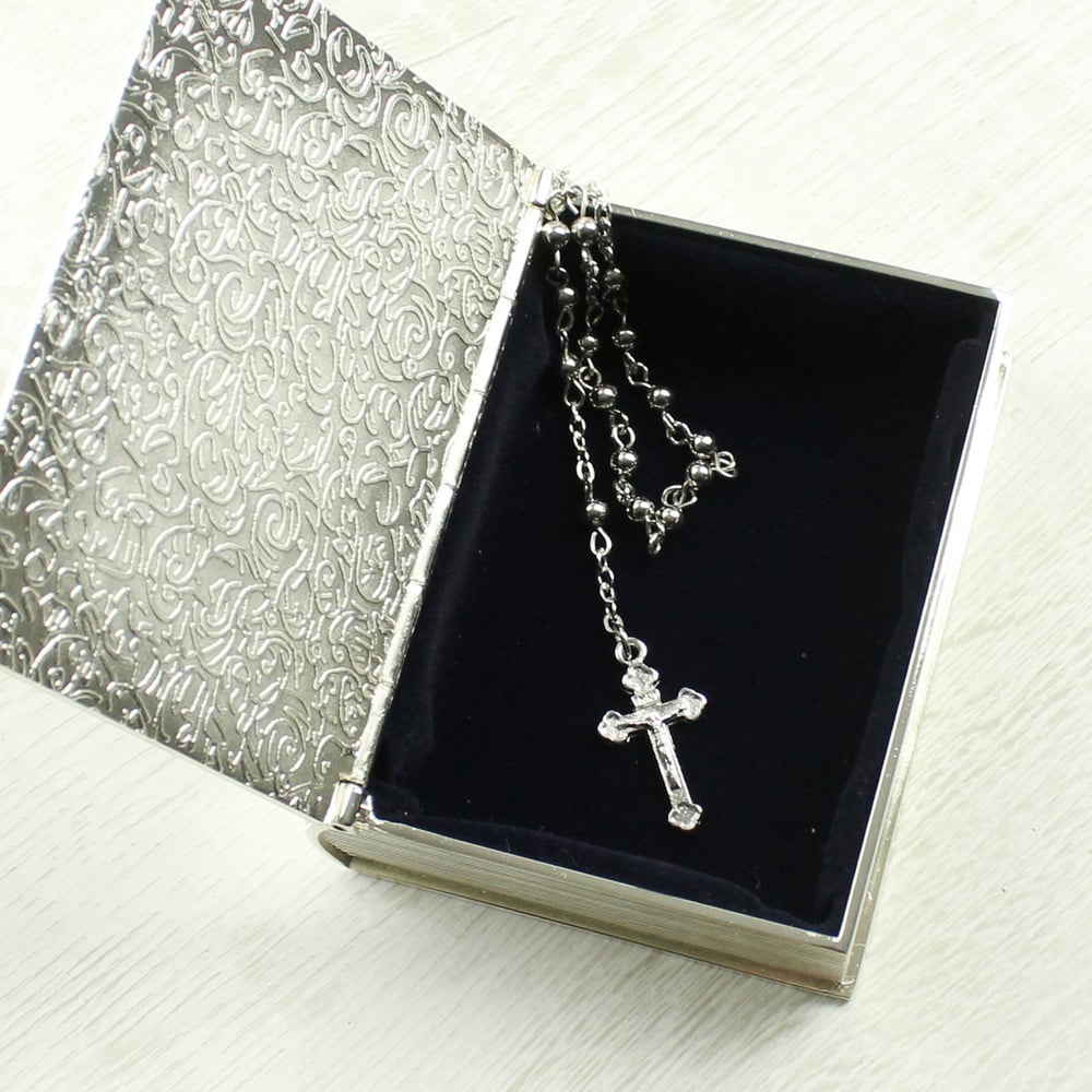 Personalise this silver finish bible trinket with any message over 3 lines. Line 1 (larger text) - Up to 20 characters, Line 2 - Up to 25 characters, Line 3 - Up to 25 characters. 'On Your First Holy Communion' is a fixed part of the design and cannot be amended. The inside of the trinket is blue flock-lined. Rosary beads are approx. 46.5cm in length. When you have placed your order, you will receive an email containing a link to personalise your item. Follow the link to submit the personalised details you require. If we don't receive your personalisation within 24 hours the order will be cancelled. Please check your junk folder for the email. Once personalisation has been submitted the order cannot be cancelled or amended as it will automatically be sent into production and will be despatched within 3 working days.