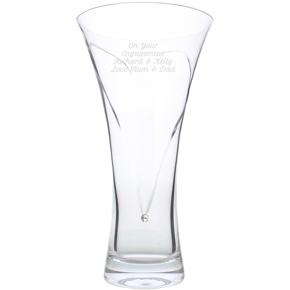 Personalise this Hand Cut Diamante Heart Vase with any message of your choice over 5 lines and up to 20 characters per line (1-4) and 4 characters on line 5.Each glass is hand cut, hand polished. Vase is supplied in a folding box. NOTE: Due to the nature of this product and the font type used please refrain from using all capitals in your personalised message. If the message is all in capitals you will find the personalisation extremely difficult to understand and may even result in personalisation being missed off the product. Many thanks for your cooperation. Happy Anniversary Mum & Dad - Acceptable HAPPY ANNIVERSARY MUM & DAD- Not acceptable. PLEASE NOTE This item is hand blown and may be subject to unique characteristics within the glass. A hand-blown glass piece may have slight irregularities, or even a slightly asymmetrical form. We are unable to guarantee imperfection free glassware Ideal for Wedding, Anniversary, Birthday, Mothers Day, Engagement. When you have placed your order, you will receive an email containing a link to personalise your item. Follow the link to submit the personalised details you require. If we don't receive your personalisation within 24 hours the order will be cancelled. Please check your junk folder for the email. Once personalisation has been submitted the order cannot be cancelled or amended as it will automatically be sent into production and will be despatched within 3 working days.