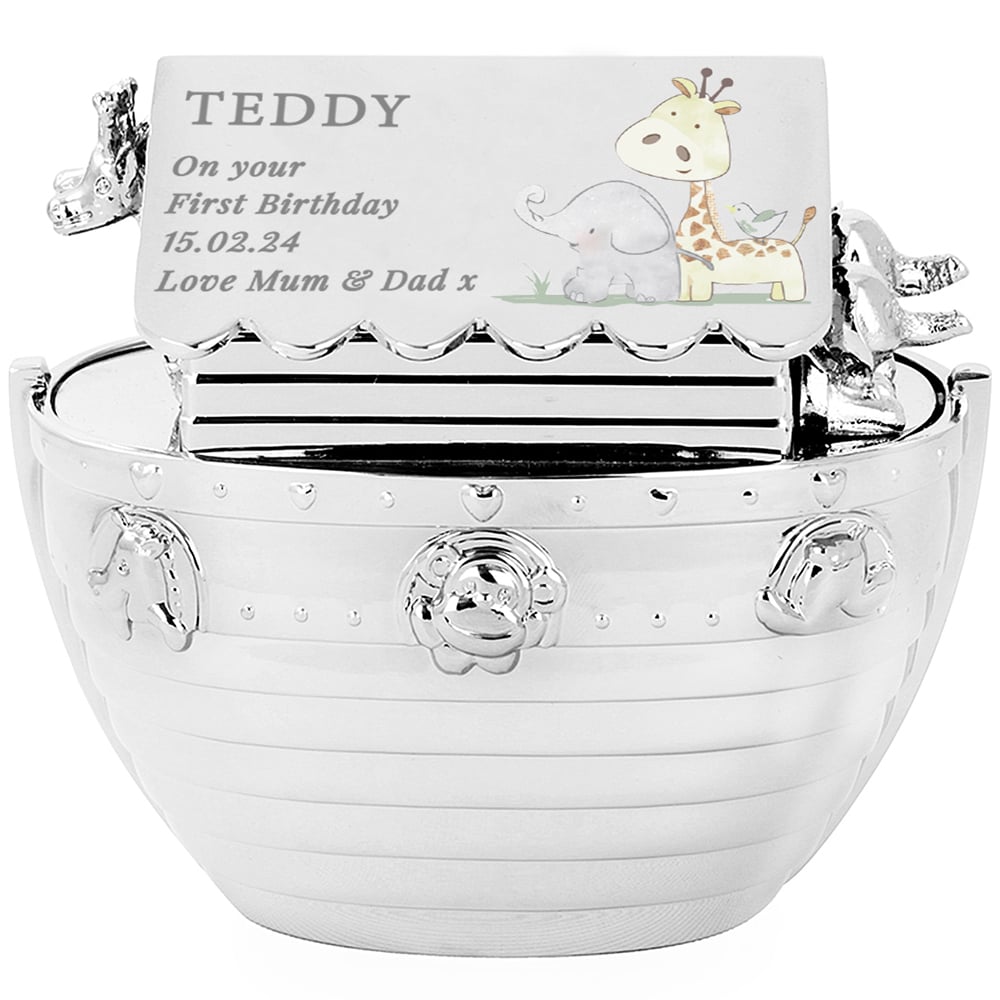 With a cute baby animal design, this silver finish Noah's Ark money box can be personalised with any message over 4 lines of text as below. Message Line 1 - 20 characters, Message Line 2 - 20 characters, Message Line 3 - 20 characters, Message Line 4 - 20 characters, Message Line 5 - 20 characters. Line 1 will appear in the fixed UPPER CASE. All other personalisation is case sensitive and will appear as entered. Money Box is nickel-plated. Ideal for Christenings. When you have placed your order, you will receive an email containing a link to personalise your item. Follow the link to submit the personalised details you require. If we don't receive your personalisation within 24 hours the order will be cancelled. Please check your junk folder for the email. Once personalisation has been submitted the order cannot be cancelled or amended as it will automatically be sent into production and will be despatched within 3 working days.