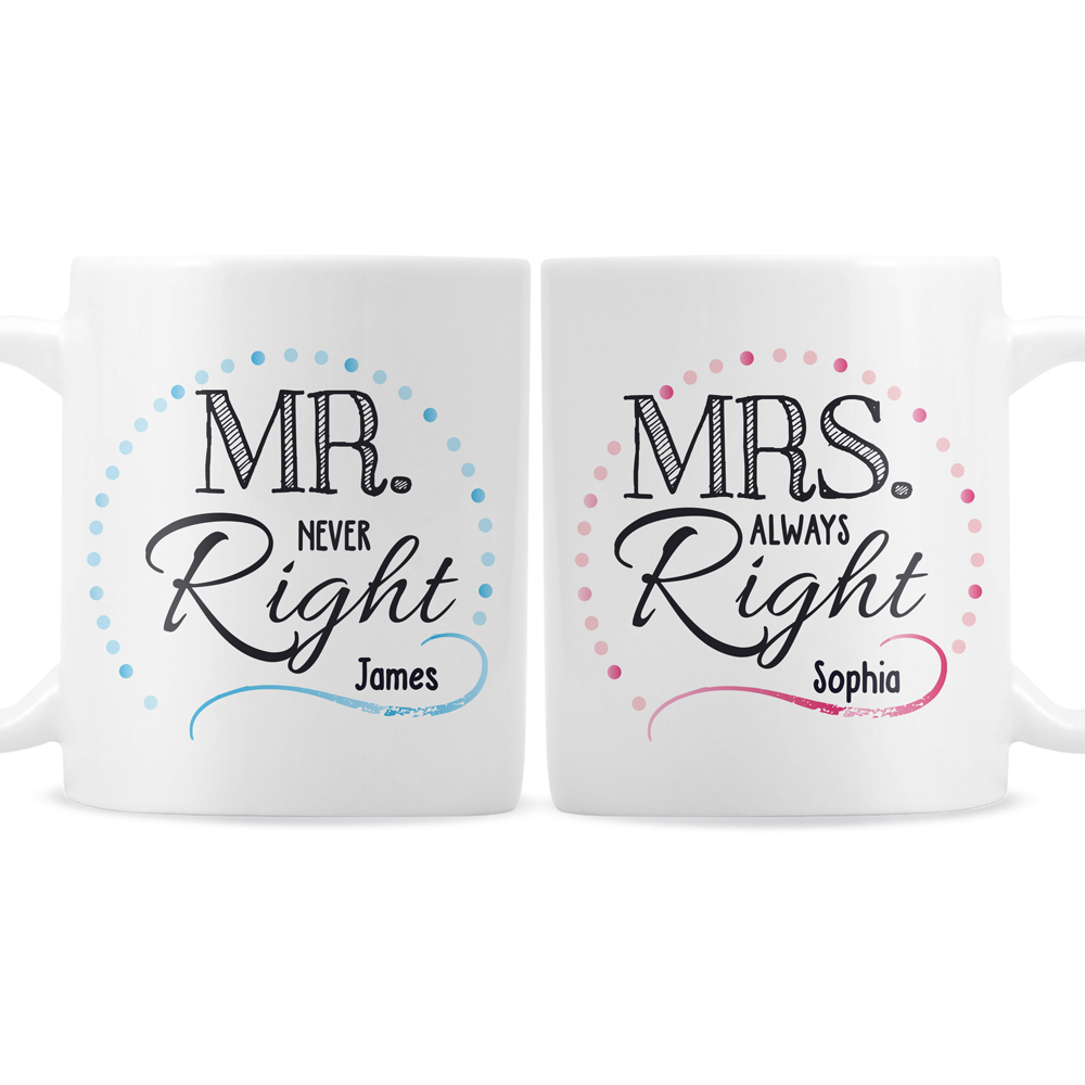 This cute mug set makes the perfect gift for a couple on any occasion. This mug set can be personalised with, Line 1 (Mrs) - 12 Characters Line 2 (Mr) - 12 Characters 'Mrs always right' and 'Mr never right' is fixed text and cannot be changed. Personalisation will appear as entered. Hand washing is recommended. The material is ceramic. Perfect for Wedding, Anniversary, Valentine's Day, and Christmas. When you have placed your order, you will receive an email containing a link to personalise your item. Follow the link to submit the personalised details you require. If we don't receive your personalisation within 24 hours the order will be cancelled. Please check your junk folder for the email. Once personalisation has been submitted the order cannot be cancelled or amended as it will automatically be sent into production and will be despatched within 3 working days.