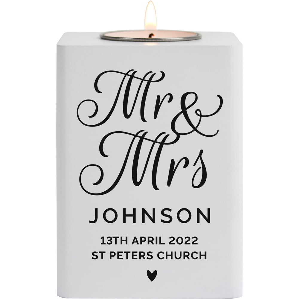 Personalised Memento Personalised Mr and Mrs White Wooden Tea Light Holder