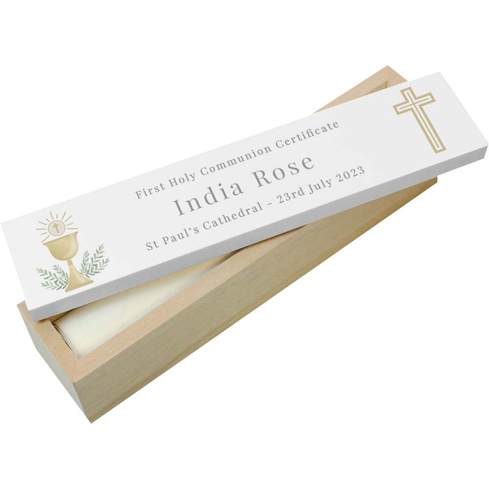 This personalised wooden certificate holder is the perfect way to keep your precious certificate safe. Message Line 1 - 45 characters, Message Line 2 - 20 characters, Message Line 2 - 45 characters, The personalisation is case sensitive and will appear as entered. The shabby chic certificate box is made from wood and the lid is hand finished so there may be slight imperfections. Ideal for First Holy Communion. When you have placed your order, you will receive an email containing a link to personalise your item. Follow the link to submit the personalised details you require. If we don't receive your personalisation within 24 hours the order will be cancelled. Please check your junk folder for the email. Once personalisation has been submitted the order cannot be cancelled or amended as it will automatically be sent into production and will be despatched within 3 working days.