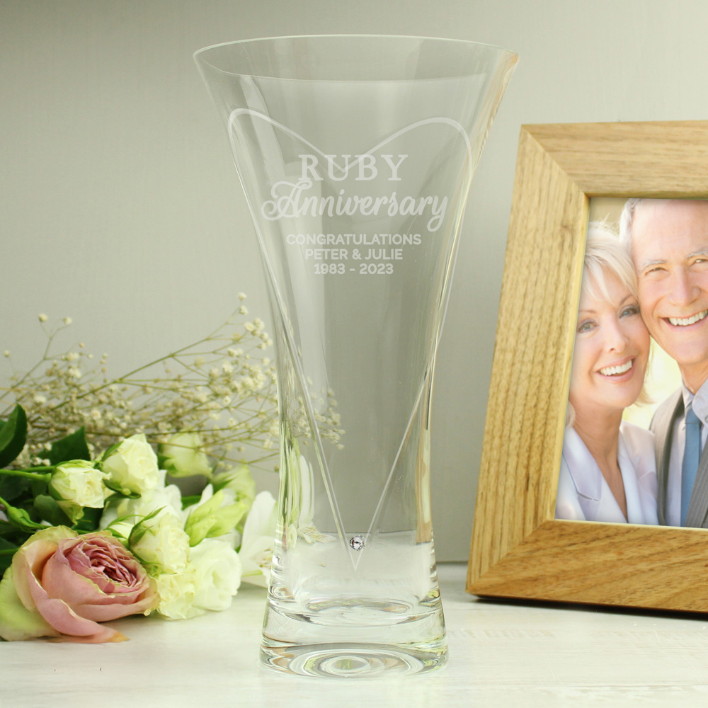 Personalise this hand-cut large diamante vase with a message of up to three lines of 20 characters. "Ruby Anniversary" is a fixed text. Personalisation will appear in fixed upper case. This Vase is 25cm tall. Hand-wash only. Please note: This type of glass is hand-cut and personalised to order. There may be slight variations in the positioning of the infinity lines. This item is hand-blown and may be subject to unique characteristics within the glass. A hand-blown glass piece may have slight irregularities or even a slightly asymmetrical form. We are unable to guarantee imperfection-free glassware. Ideal for Anniversaries. When you have placed your order, you will receive an email containing a link to personalise your item. Follow the link to submit the personalised details you require. If personalisation is not received within 24 hours the order will be cancelled. Please check your junk folder for the email. Once personalisation has been submitted the order cannot be cancelled or amended as it will automatically be sent into production and will be despatched within three working days.