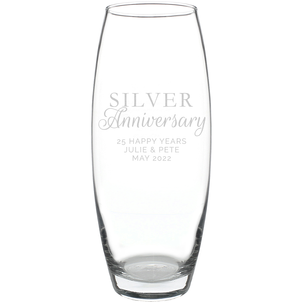 This stylish and elegant vase is a perfect gift to celebrate Silver wedding anniversary. You can personalise this vase with three lines of text up to 20 characters per line. All personalisation will automatically appear in uppercase. The Silver Anniversary is a fixed text and cannot be changed. Hand Wash Only. Please note that these vases may contain bubbles in the glass and slight imperfections due to the manufacturing process. Ideal for an anniversary. When you have placed your order, you will receive an email containing a link to personalise your item. Follow the link to submit the personalised details you require. If we don't receive your personalisation within 24 hours the order will be cancelled. Please check your junk folder for the email. Once personalisation has been submitted the order cannot be cancelled or amended as it will automatically be sent into production and will be despatched within three working days.