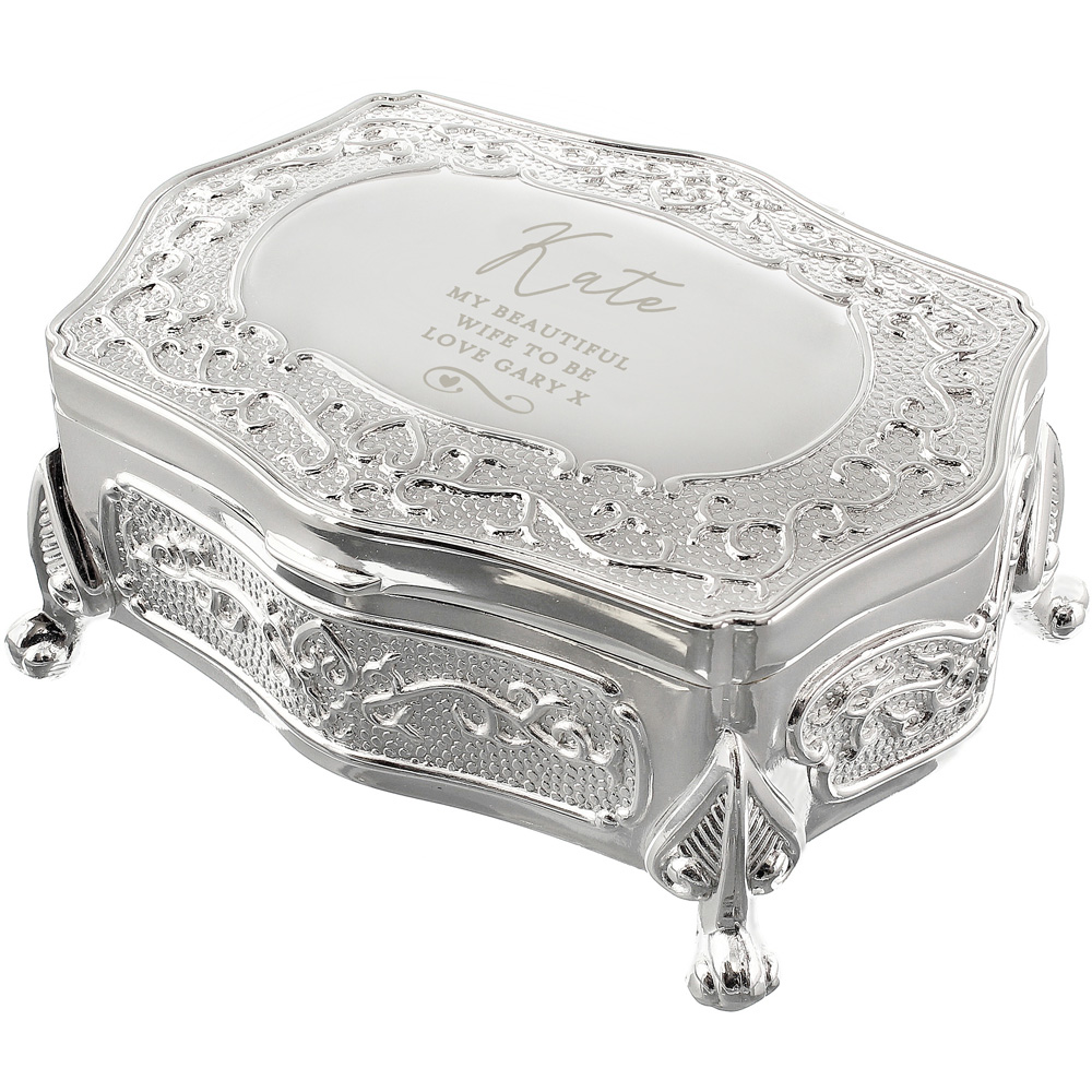 The Swirls and Hearts Small Antique Trinket Box is perfectly formed to house a sentimental piece of jewellery. It can be personalised with any name or role of up to 12 characters and a message over 2 lines of up to 20 characters per line. Please note, the text on line 1 is case sensitive and will appear as entered, however, due to the font used please avoid entering all your text in block capitals for the name as this may result in the personalisation being difficult to read. All other personalisation will appear in fixed uppercase. The lid is hinged. Trinket is lined in a flock fabric. Ideal for Wedding, Birthday, Mother's Day, Valentine's Day. When you have placed your order, you will receive an email containing a link to personalise your item. Follow the link to submit the personalised details you require. If we don't receive your personalisation within 24 hours the order will be cancelled. Please check your junk folder for the email. Once personalisation has been submitted the order cannot be cancelled or amended as it will automatically be sent into production and will be despatched within 3 working days.