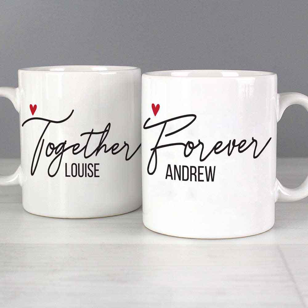 This stylish personalised Together Forever Mug Set is a perfect way of showing the world you are built to last the distance! This mug set can be personalised with 2 names with up to 12 characters per name, with one name on each mug. The names will appear in UPPERCASE. The text #Together' on the left mug and #Forever' on the right mug is fixed and cannot be amended. Hand washing is recommended. The material is ceramic. Perfect for Wedding, Anniversary, Valentine's Day, and Christmas. When you have placed your order, you will receive an email containing a link to personalise your item. Follow the link to submit the personalised details you require. If we don't receive your personalisation within 24 hours the order will be cancelled. Please check your junk folder for the email. Once personalisation has been submitted the order cannot be cancelled or amended as it will automatically be sent into production and will be despatched within 3 working days.