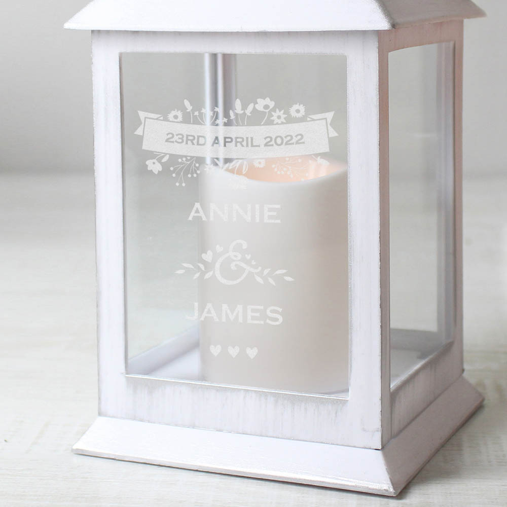 This Personalised Couple's Floral White Lantern is perfect for celebrating an anniversary, or as a wedding venue decoration. This lantern can be personalised with a date or message up to 20 characters (in the banner) and 2 names up to 10 characters each. All text entered will appear in upper case. The '&' symbol is fixed. The battery-powered lantern has a realistic flickering warm orange flame effect, adding an ambient touch to any room. The lantern is easy to hang around the home with the hoop attached. The lantern can be switched on/off from a switch on the base. Please note that the lantern is supplied without batteries. The lantern requires x3 AAA batteries. This product has a matt plastic finish. Suitable for indoor use only. Ideal for weddings, anniversaries, engagement parties and Valentine's day. When you have placed your order, you will receive an email containing a link to personalise your item. Follow the link to submit the personalised details you require. If the personalisation is not received within 24 hours the order will be cancelled. Please check your junk folder for the email. Once personalisation has been submitted the order cannot be cancelled or amended as it will automatically be sent into production and will be despatched within 3 working days.