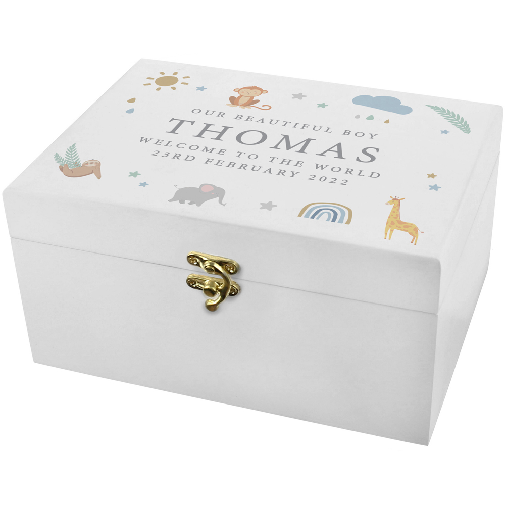 This cute animal wooden keepsake box is perfect for storing their most important souvenirs and keepsakes. This wooden keepsake box can be personalised with a message of up to 3 lines as below Message Line 1 - 25 characters Name - 15 characters Message Line 2 - 25 characters Message Line 3 - 25 characters Please note that the personalisation will appear in upper case. Please also note that these keepsake boxes are hand painted and are made from natural wood, which may mean that there are some slight blemishes on the surface of the box or grooves in the wood. This box also features a sturdy metal clasp and metal hinges, ensuring that your precious keepsakes are kept safe and secure. This keepsake box is ideal for storing all manner of trinkets, souvenirs and mementoes and is well suited to lots of occasions. Alternatively, why not fill the box with small gifts and treats, ready to present to the recipient? Contents not included. Ideal for Baby Showers and New Baby Please note we cannot ship this item internationally. When you have placed your order, you will receive an email containing a link to personalise your item. Follow the link to submit the personalised details you require. If we don't receive your personalisation within 24 hours the order will be cancelled. Please check your junk folder for the email. Once personalisation has been submitted the order cannot be cancelled or amended as it will automatically be sent into production and will be despatched within 3 working days.