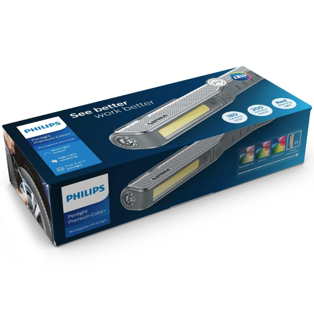 Make a practical addition to your workshop with the Philips Professional Penlight Premium Colour Plus LED Work Light. The light features a sturdy aluminium housing and delivers powerful, high-quality illumination. Its innovative Colour+ function accurately represents object colours. This durable lamp is resistant to shocks, chemicals, and water, ensuring long-lasting performance. With a high Colour Rendering Index (CRI*), it allows for quick and precise inspection of car bodies, enabling detailed assessment of paint, polish, and cleaning. Its IK07 shock resistance makes it ideal for tough working environments, while its water resistance to IP54 standards and chemical-resistant surface enhance its durability. This pocket-sized tool is designed to endure diverse tasks and environments. With impact and scratch resistance, it offers safe and reliable use both indoors and outdoors.