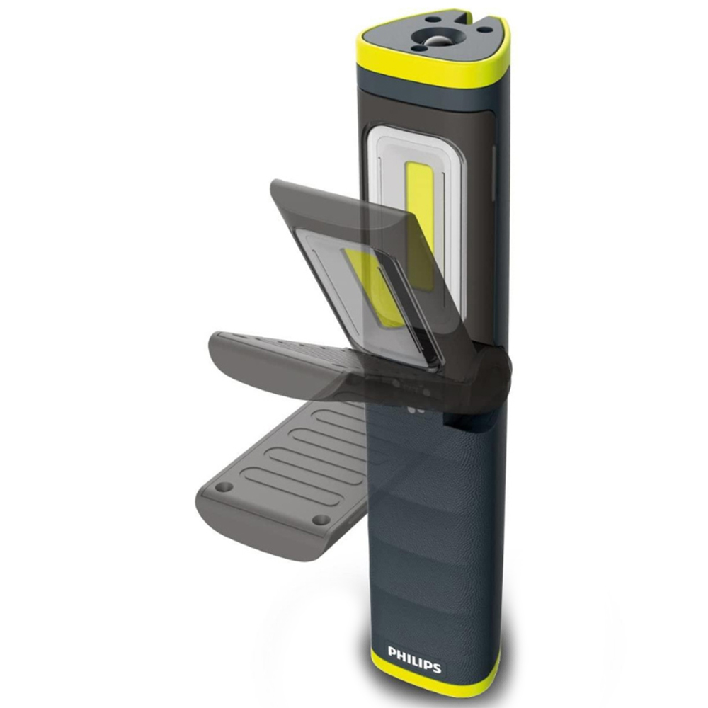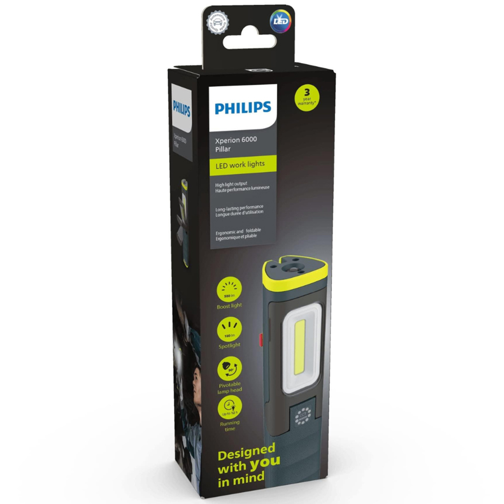 Make a practical addition to your workshop with the Philips Xperion 6000 Pillar LED Work Light. The work light is a reliable and versatile tool that offers long-lasting illumination. With a single charge, it can last all day, making it perfect for a full day's work. It features a bright main light with 250 and 500 lumens, providing high-quality LED light that accurately displays objects and details. Additionally, the inbuilt 180-lumen torch is great for spotting small details and navigating in low-light conditions. The work light is designed to be portable and easy to use, with a foldable design for convenient carrying and adjustable lighting angles to suit different needs. It also comes with a powerful Li-ion battery that can be fully charged within 4.5 hours via USB-C, ensuring maximum usage of its bright LED light. The ergonomically shaped handle with an anti-slip coating allows for a secure grip, and the 360° rotatable, retractable hook and strong magnet provide versatile positioning options when you need to work hands-free.