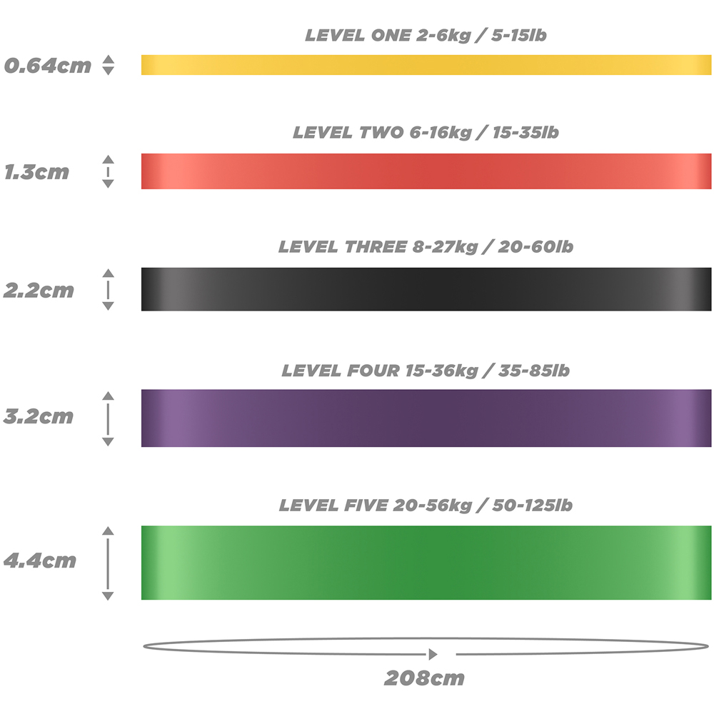 - Includes 5 colour-coded resistance bands, each labelled for easy identification