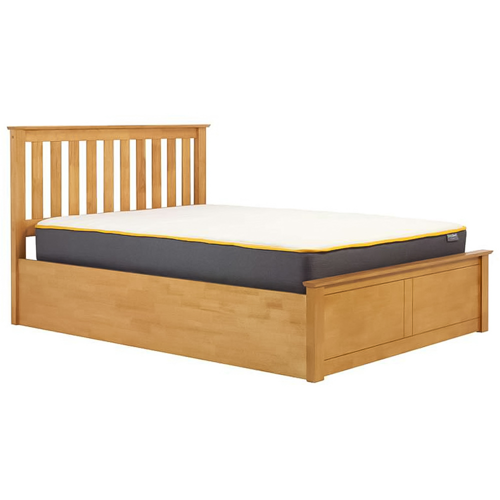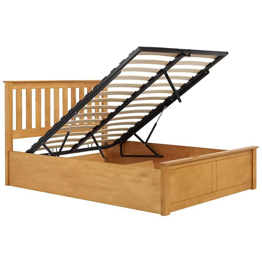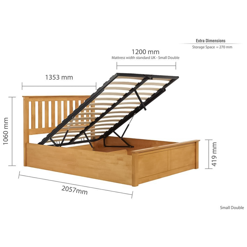 Experience the epitome of elegance with the Phoenix Small Double Brown Ottoman Bed Frame. This wooden Ottoman bed provides both class and practicality with plenty of storage space. It has been crafted using solid rubberwood for extra durability. This bed features a sprung slatted base to give natural bounce, adjusting to where pressure is most exerted to provide greater comfort. It also features an easy lift mechanism for instant access to the concealed storage space. This lift mechanism is supported by quality gas pistons with a strength of 588 N that can support mattresses up to the weight of 45kg. The maximum weight load for this Ottoman bed frame is 350kg and it provides utmost comfort with a sturdy base. Please note the mattress needs to be on the bed for the pistons to work. These beds are only suitable for a UK standard size mattress and the recommended maximum mattress height is 203mm.