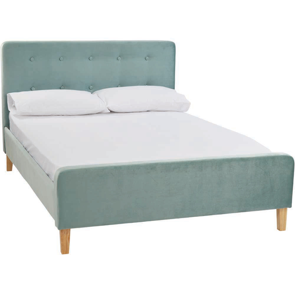 The Pierre Double Bed Frame is a simple yet stylish soft, velvet aqua upholstered bed with contrasting light wooden legs and a classic button detail on the headboard. Elegantly clad in the same aqua blue upholstery as the headboard, the frame and footboard are inviting and sumptuous. Characterising a relaxing and calm environment, this bed is delicious in its design and will make any bedroom into a stunning boudoir with its addition.