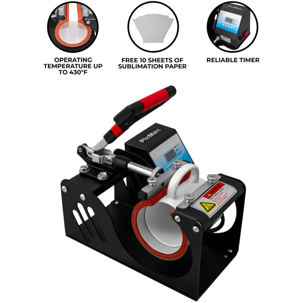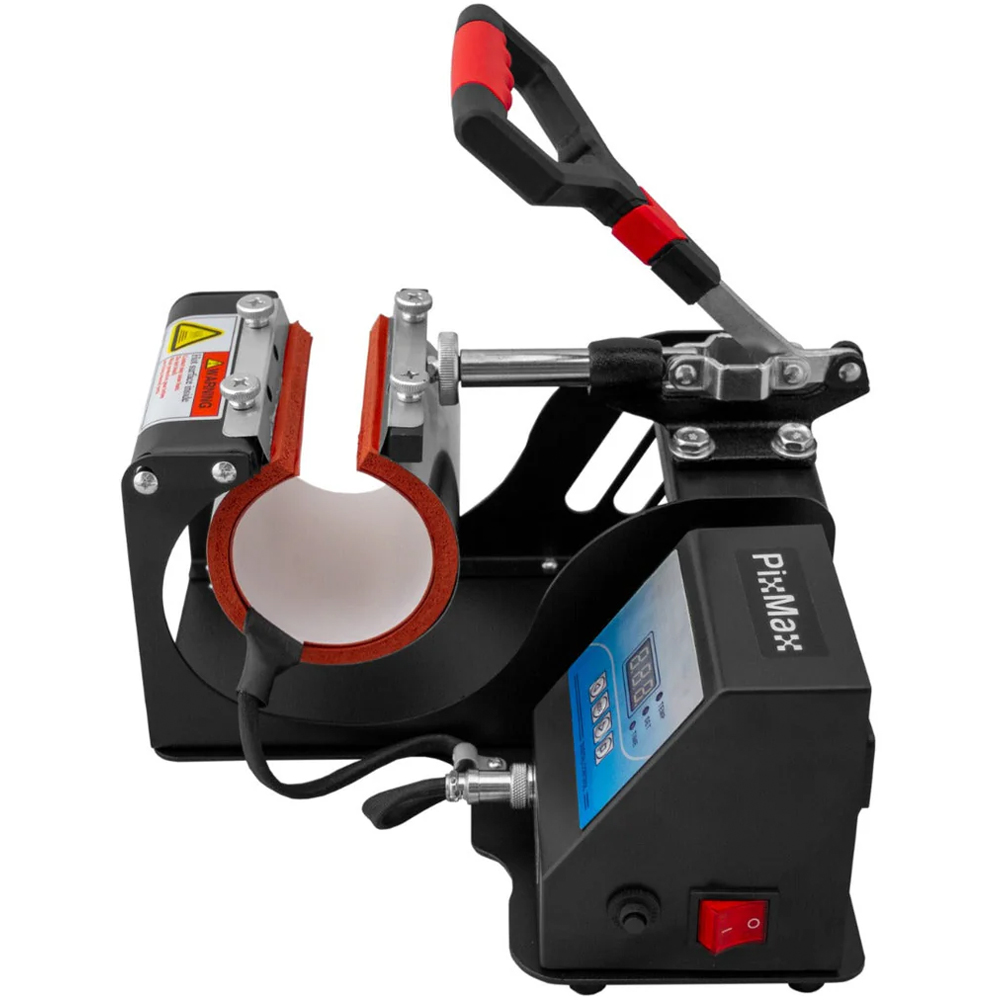 Make Your Own Personalised Mugs At last, the opportunity to do what you've always wanted to do - what everyone in Britain has, if they admit it, always wanted to do - and print your very own mugs. Whether for gifts or for selling, the ability to print mugs is an incredible skill to possess, particularly in our tea-guzzling nation where few things are more personal to us than our special mugs. Heat press your designs onto 11oz mugs with a professional and even finish, so your mugs look great every time. Easy To Use Mug Press Machine If you have an eye for design, a quick wit or a recognisable brand then the results of your effortless printing with this mug press machine could earn your extra cash and a valuable marketing opportunity. Even a beginner can immediately get to grips with this professional but easy-to-use mug press machine, with the clear and helpful instruction manual to guide you through the process from beginning to "two sugars please". We'll even throw in 10 free sheets of sublimation paper and a roll of heat tape to get you started, but please be aware that your designs need to be printed onto the paper using sublimation ink. Sublimation Mug Press Machine Features * PixMax mug press machine for sublimation heat pressing * 11oz mug attachment * Compact design and easily portable so you can take it with you everywhere and show it off * Pressure adjustable * Easy to use control interface that even a beginner can handle * A fantastic 200-430ºF temperature range * Time range of 0-999 seconds * Teflon coated press surface * FREE 10 sheet pack of sublimation paper to get you started * FREE 22m roll of heat resistant tape