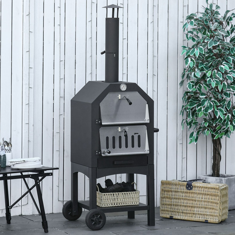 Cook restaurant-quality pizza in the comfort of your own home with this 3-Tier Charcoal Pizza Oven and BBQ Grill from Outsunny. With three tiers, this device features a simple design where an on-unit thermometer on the top helps you note the heat level to avoid burning, and the tall chimney safely extracts heat for maximum safety. Ensure quick and efficient cooking with this 2-in-1 device, which will give you endless excuses for getting everyone over once the sun comes out to shine. Easy to use, the device comes with wheels for better manoeuvring and a tough stainless-steel body that is heat, rust, and scratch-resistant for reliable outdoor use.