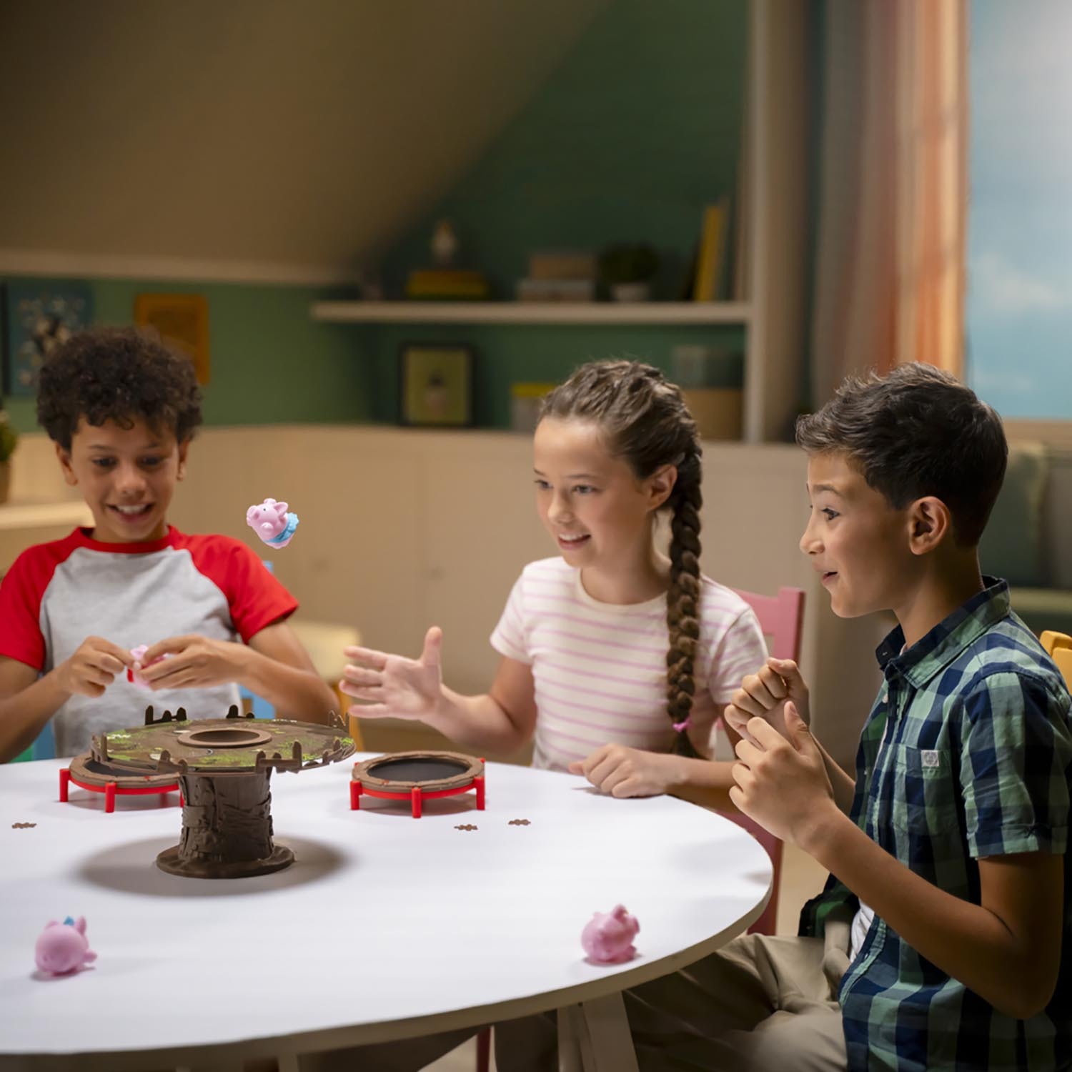 Yippeee! Jump for joy with Pigs on Trampolines! Use the trampolines to bounce your pigs into the pig pen and try to land in the mud puddle! Every pig you land in the puddle earns you a mud pie. Keep bouncing your pigs until all the mud pies are gone - the muddiest piggy wins!